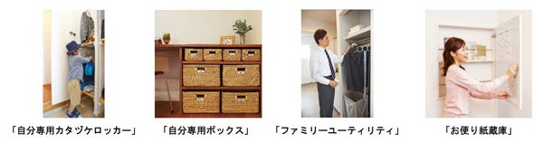 一部の住戸のリビングやダイニングには、「自分専用ボックス」を設け、雑誌や美容グッズ、勉強道具などを家族が個別に管理することで、整理整頓を行いやすくするとともに、学校からの配布物やダイレクトメールなどの紙類を、家族全員が確認できる収納庫「お便り紙蔵庫(かみぞうこ)」を設置し、家族全員で家事をシェアする習慣を身につけやすくしました。