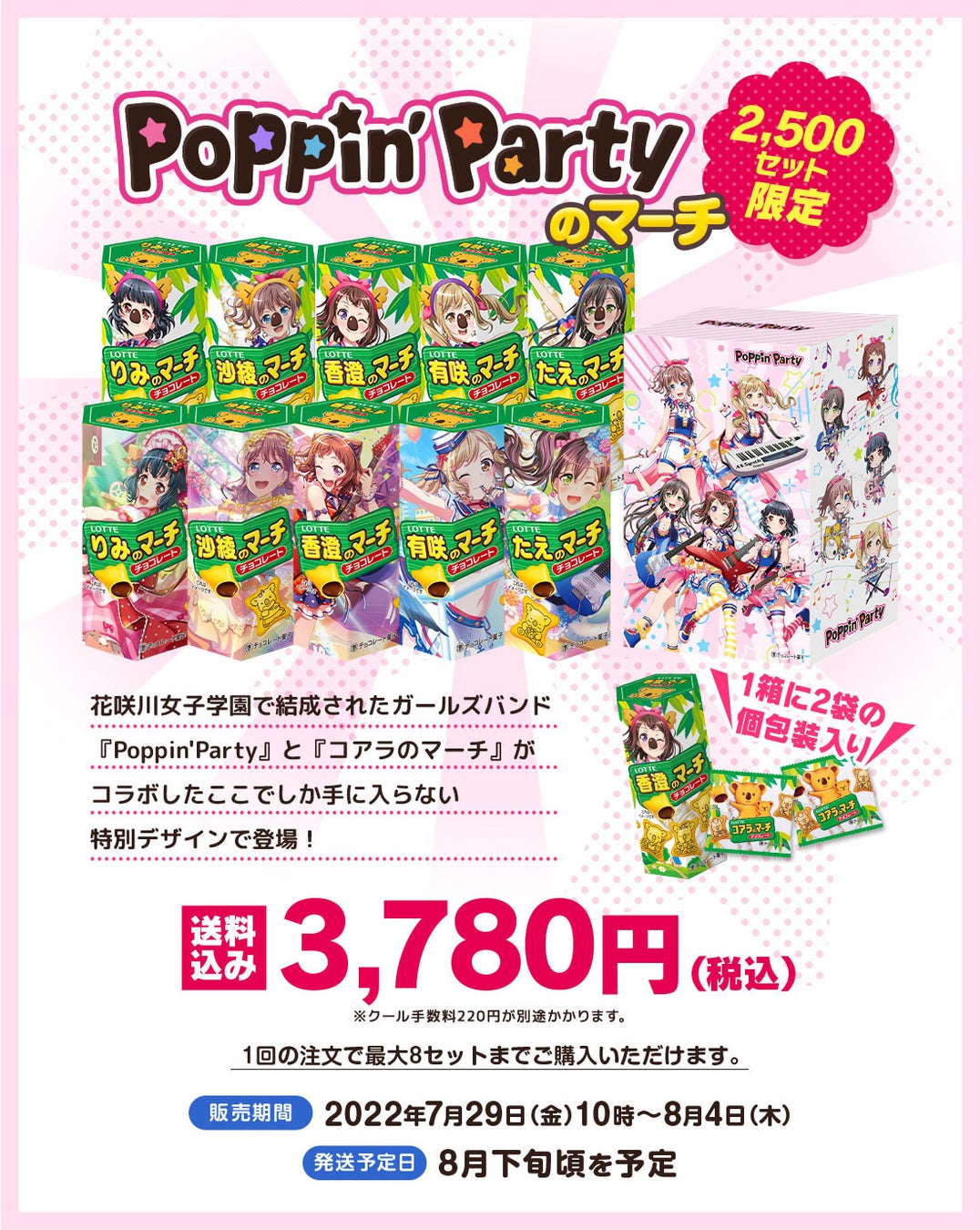 株式会社ロッテは7月29日(金)に、ロッテオンラインショップ限定で『オリジナルコアラのマーチ』シリーズから『Poppin’Partyのマーチ』の販売を開始します。2022年7月から2023年1月にかけて、(株)ブシロード協力のもと、「バンドリ! ガールズバンドパーティ!」の全7バンドとコアラのマーチがコラボし、「ガルパのマーチ」として毎月各バンドのコアラのマーチを販売いたします。『Poppin’Partyのマーチ』はロッテオンラインショップにて2,500セット限定、期間限定での販売となります。ぜひお買い求めください。