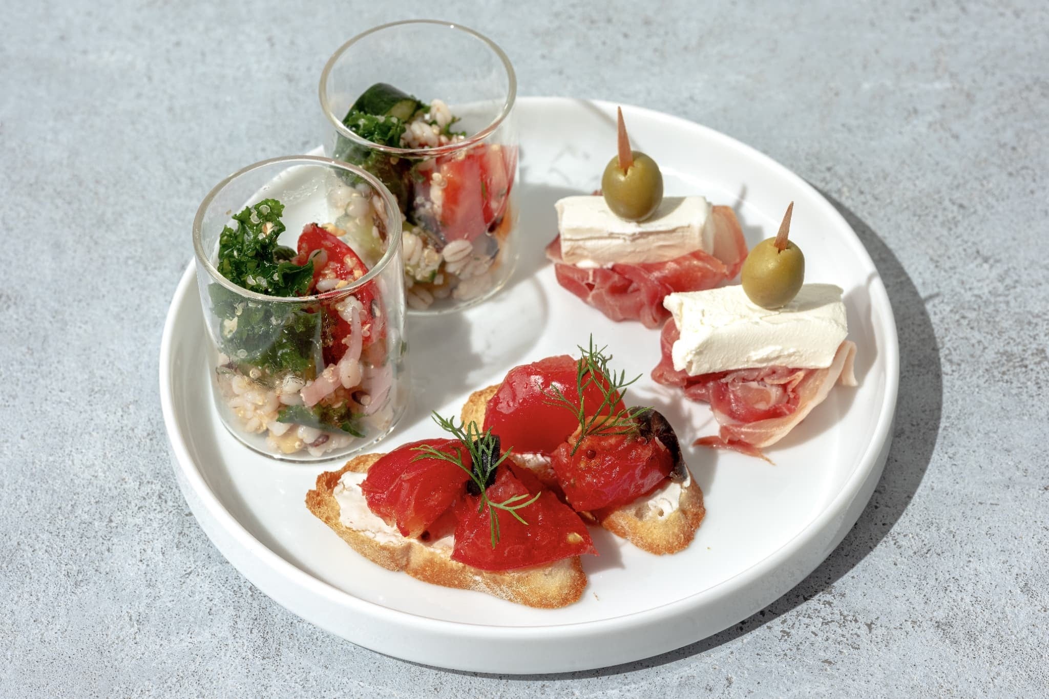 生ハム、オリーブとクリームチーズのピンチョス、オリーブ&トマトのブルスケッタ、季節のデリ:押し麦とケールのチョップドサラダ-ハーブフレンチドレッシング-