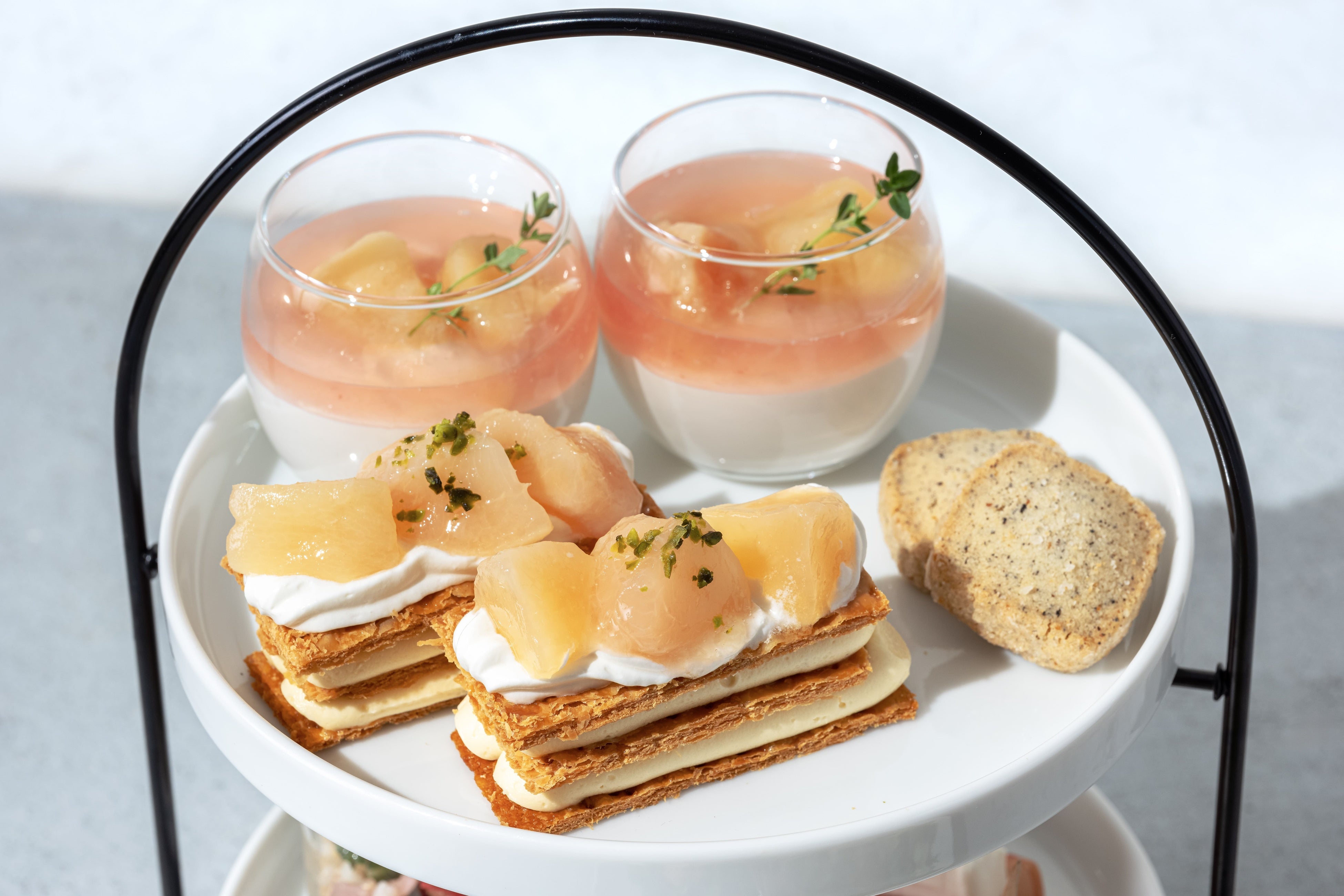 桃のミルフィーユ、茉莉花茶のブランマンジェ&桃のコンポートソース、焼き菓子