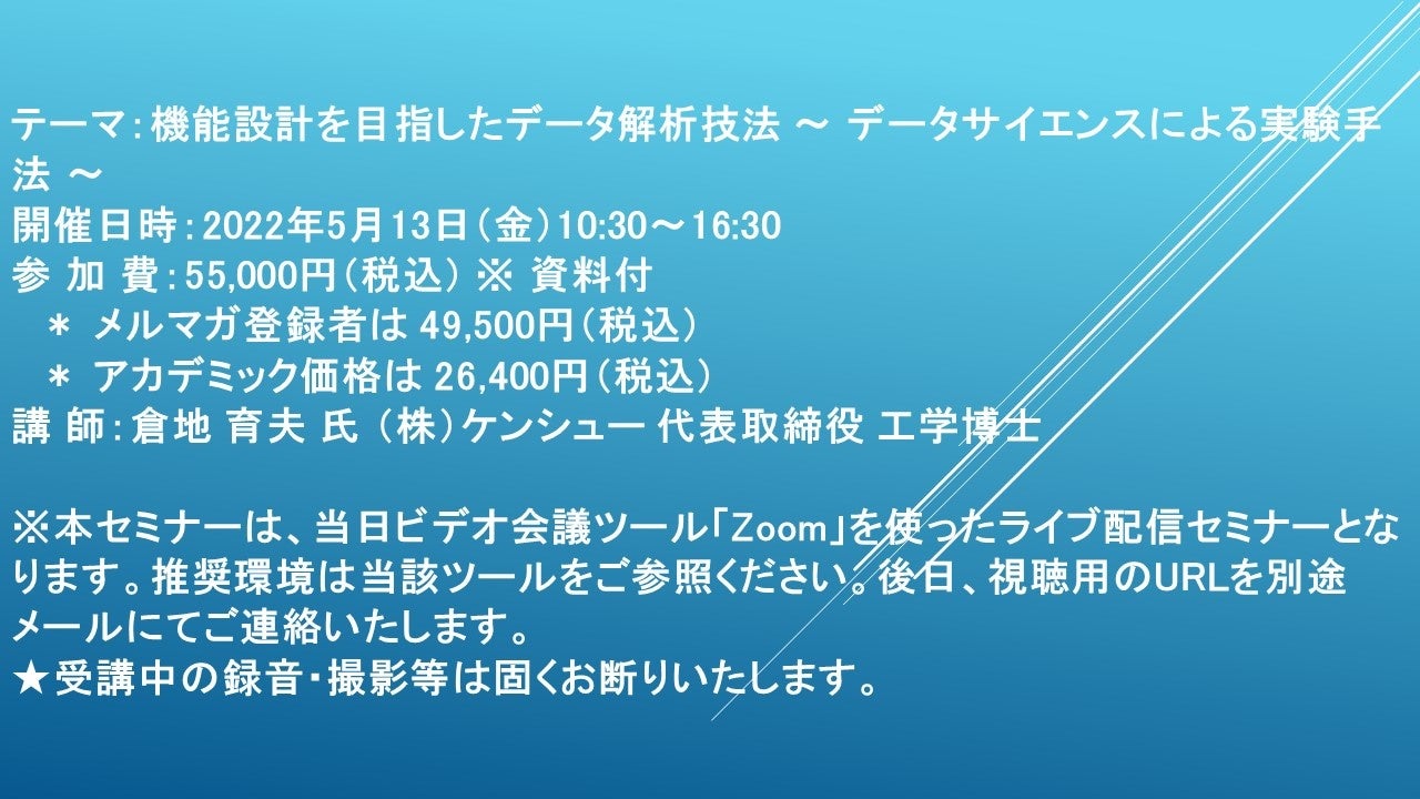 【ライブ配信セミナー】機能設計を目指したデータ解析技法 ~ データサイエンスによる実験手法 ~ 5月13日(金)開催 主催:(株)シーエムシー・リサーチ