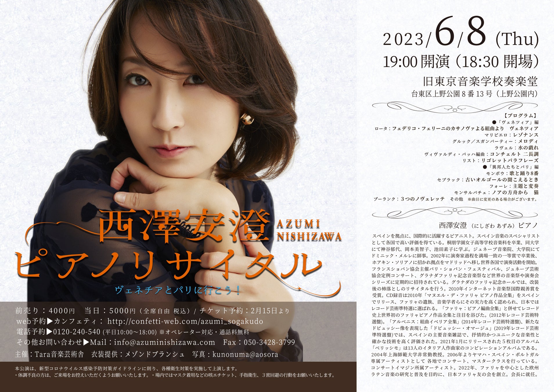 Tara音楽芸術舎主催、西澤安澄 ピアノリサイタル『ヴェネツィアとパリに行こう!』が2023年6月8日 (木)に旧東京音楽学校奏楽堂(東京都台東区上野公園8-43)にて開催されます。チケットはカンフェティ(運営:ロングランプランニング株式会社、東京都新宿区、代表取締役:榑松 大剛)にて発売中です。