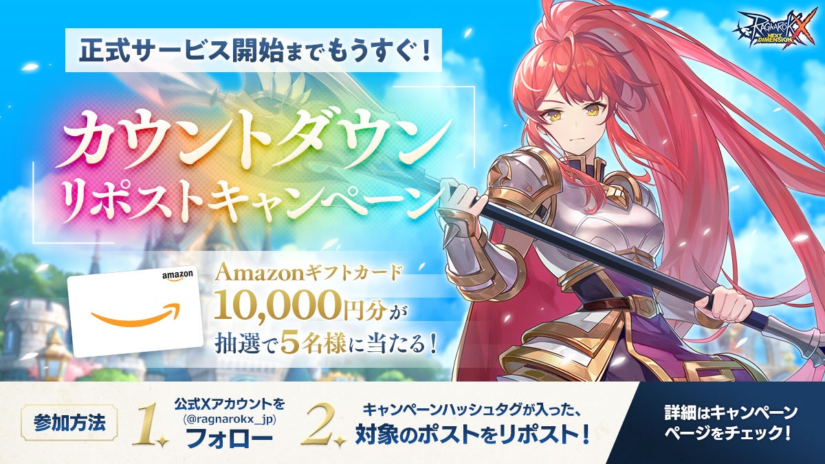 この度の正式サービス開始日決定を記念し、Xにてリポストキャンペーンを実施いたします。『ラグナロクX』の公式Xアカウント(@ragnarokx_jp)をフォローし、キャンペーンハッシュタグが入った対象のポストをリポストしてください。抽選で5名様に、Amazonギフトカード10,000円分が当たります。まだ『ラグナロクX』公式Xアカウントをフォローしていない方は、この機会にフォローして、キャンペーンにご参加ください。