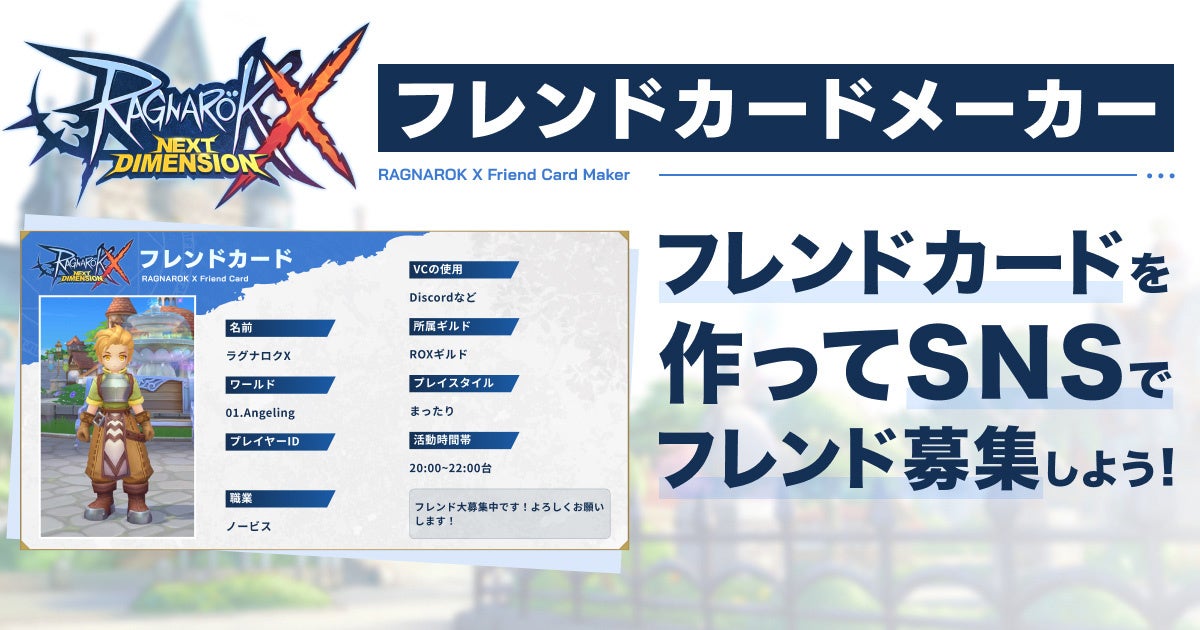 正式サービス開始に先駆け、『ラグナロクX』では皆様の“推し活”を応援すべく、「ファンキット」および「フレンドカードメーカー」、「ギルドカードメーカー」をご用意いたしました。一緒に冒険する友達や仲間をSNS上で探す際や、ブログなどでファン活動をお知らせするときなどに、どうぞご活用ください。