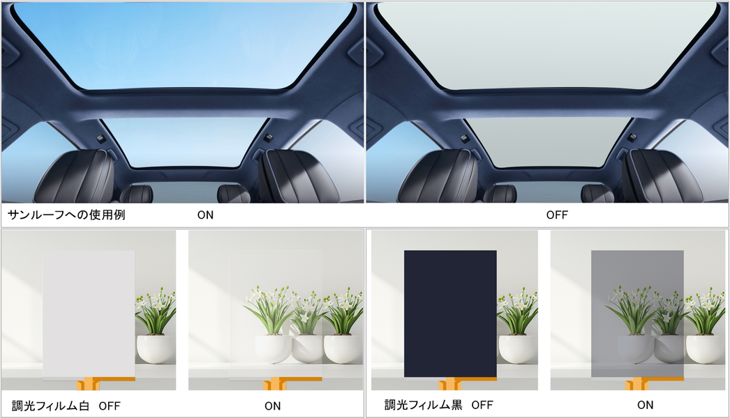 電源のON/OFFで瞬時に透明度を切り替えられるPDLC調光フィルム。サンルーフ等の応用に最適です。高精度のレーザー技術を用いて、多分割カスタマイズにも対応。グローバルで多数の車載採用実績があり、20年以上の開発経験に裏打ちされた高品質が特長です。