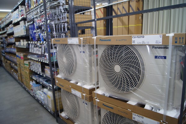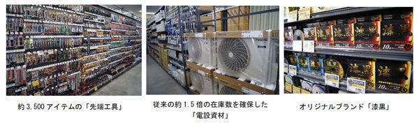 当店では、電動工具に取り付ける「先端工具」を約3,500アイテム、ねじなどの「締結部材」を約1,500アイテム取り揃えたほか、エアコンの配線器具などの「電設資材」は、従来の約1.5倍の在庫数を確保し、工具や資材などを中心に約36,000アイテム取り揃えました。