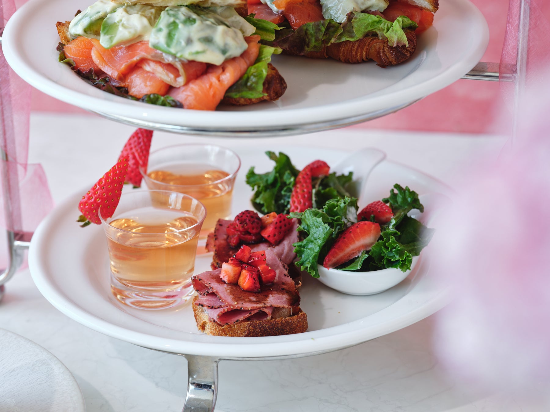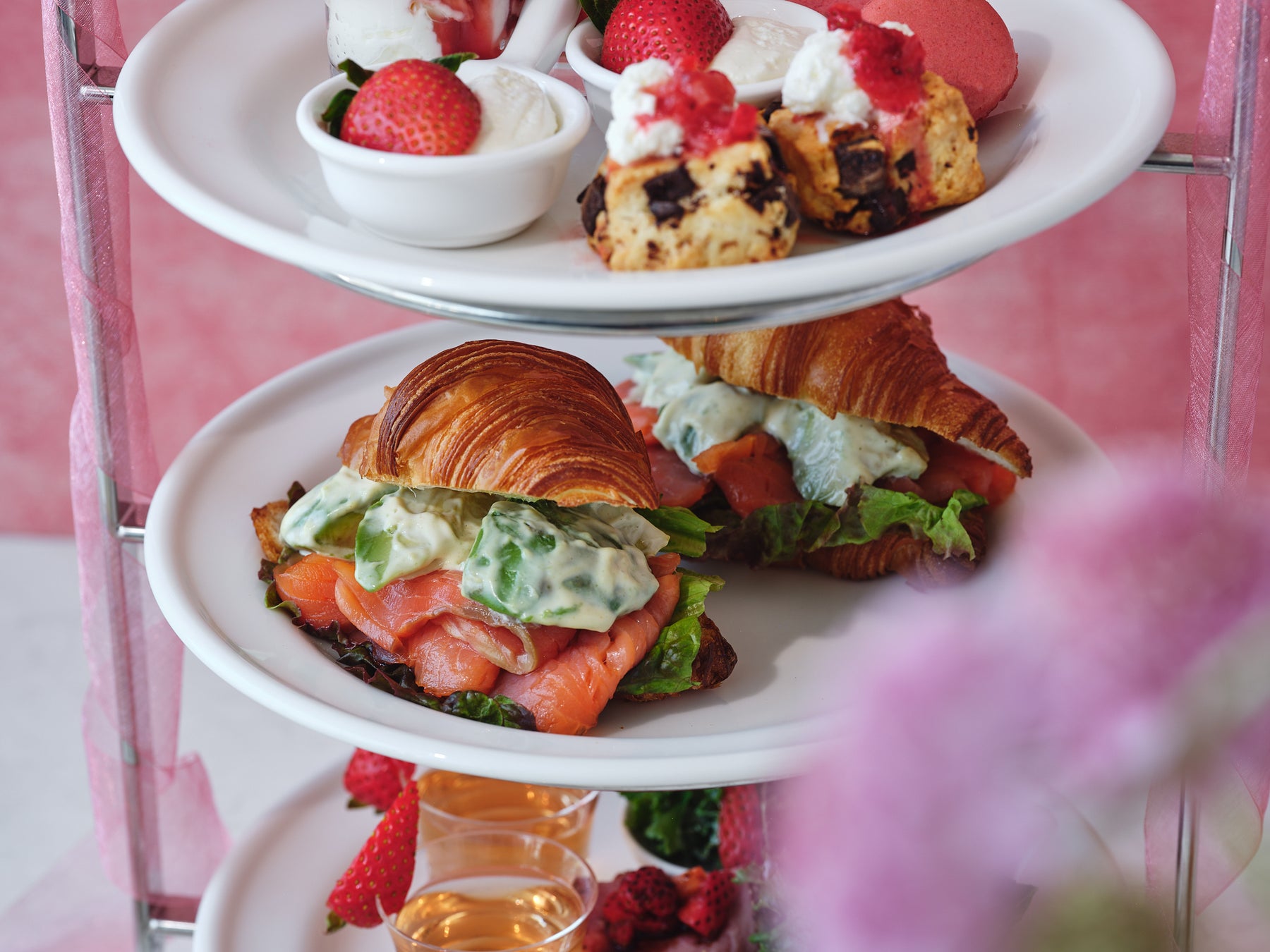 RITUEL CAFÉ ルミネ新宿店のティースタンドは、三段構成でご用意しています。紅茶、カフェラテボウル、コーヒーなどの豊富なドリンクメニューが時間内でおかわり自由となっております。ティースタンド上段のお皿には、苺のソースと食べる“苺のショコラスコーン”、爽やかな酸味の苺ソースが相性抜群の“苺のレアチーズケーキ”、“夏秋苺のミニパンケーキ”、“ラズベリーマカロン”をご用意。中段のお皿には、 RITUEL自慢のクロワッサンに、サーモンとアボカドにマスタードマヨを和えたのをサンドした“サーモンとアボカドのクロワッサンサンド”。下段のお皿には、マスカルポーネで和えた“夏秋苺とケールのフロマージュサラダ”、“パストラミと夏秋苺のタルティーヌ”、“夏秋苺のロゼスパークリングゼリー”をご用意しました。また、別皿で季節限定のケーキや、定番のモンブランタルト、フロマージュキュイなど、約10種類の中から、お好きなカットケーキをお一つお選びいただけます。また、同内容に、ウェルカムドリンクが付いたコースもご用意しています。こちらのコースは、ロゼスパークリングorノンアルコールブルーティーソーダより、お好きな乾杯ドリンクをお選びいただけます。