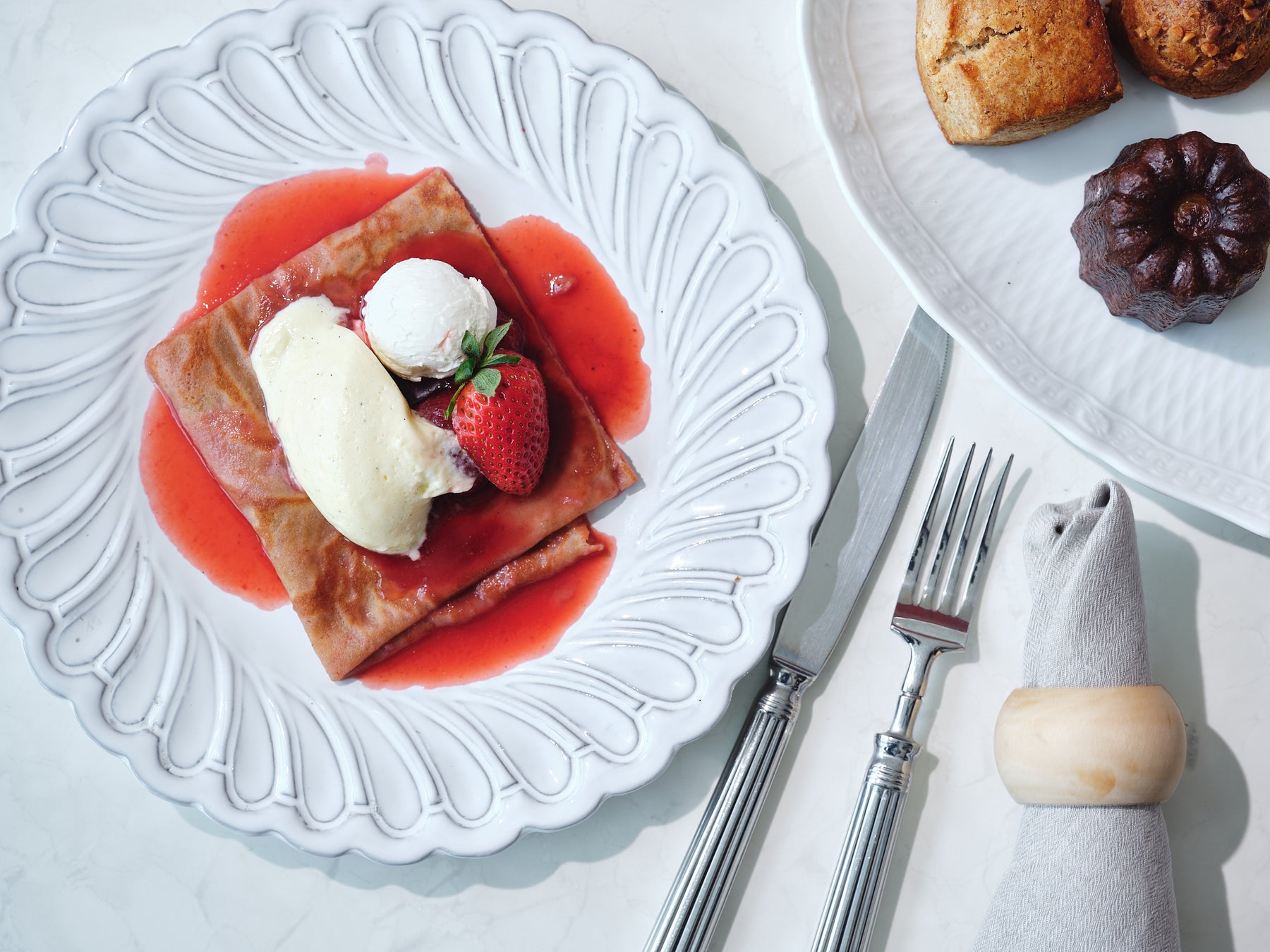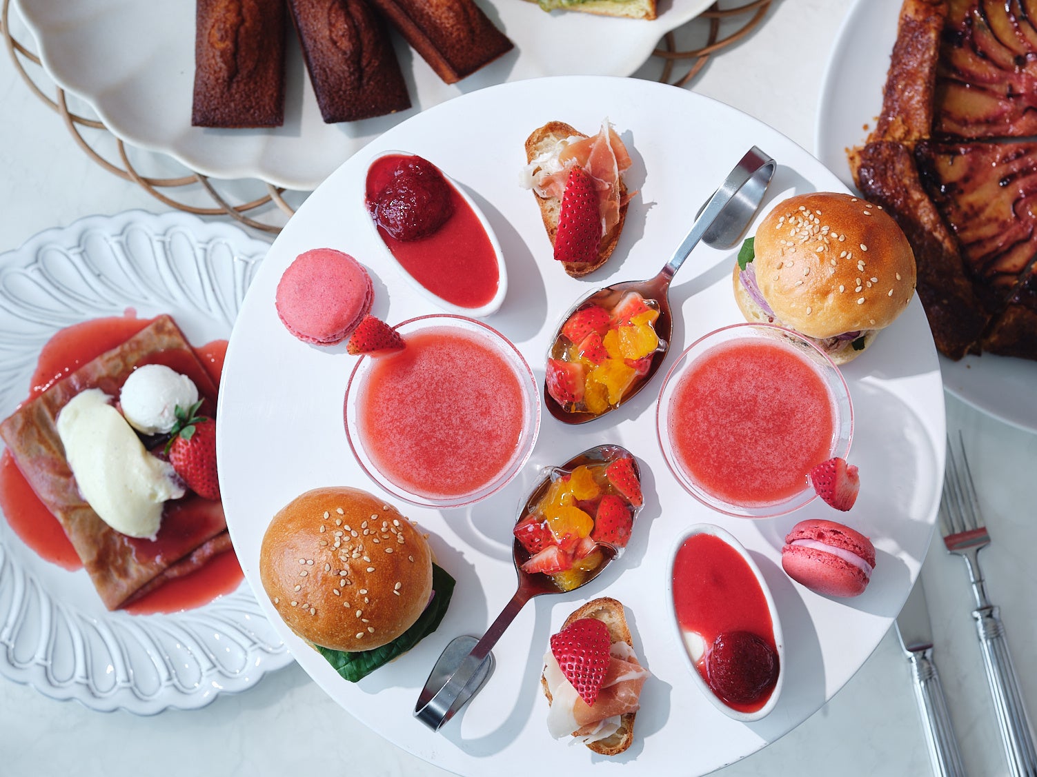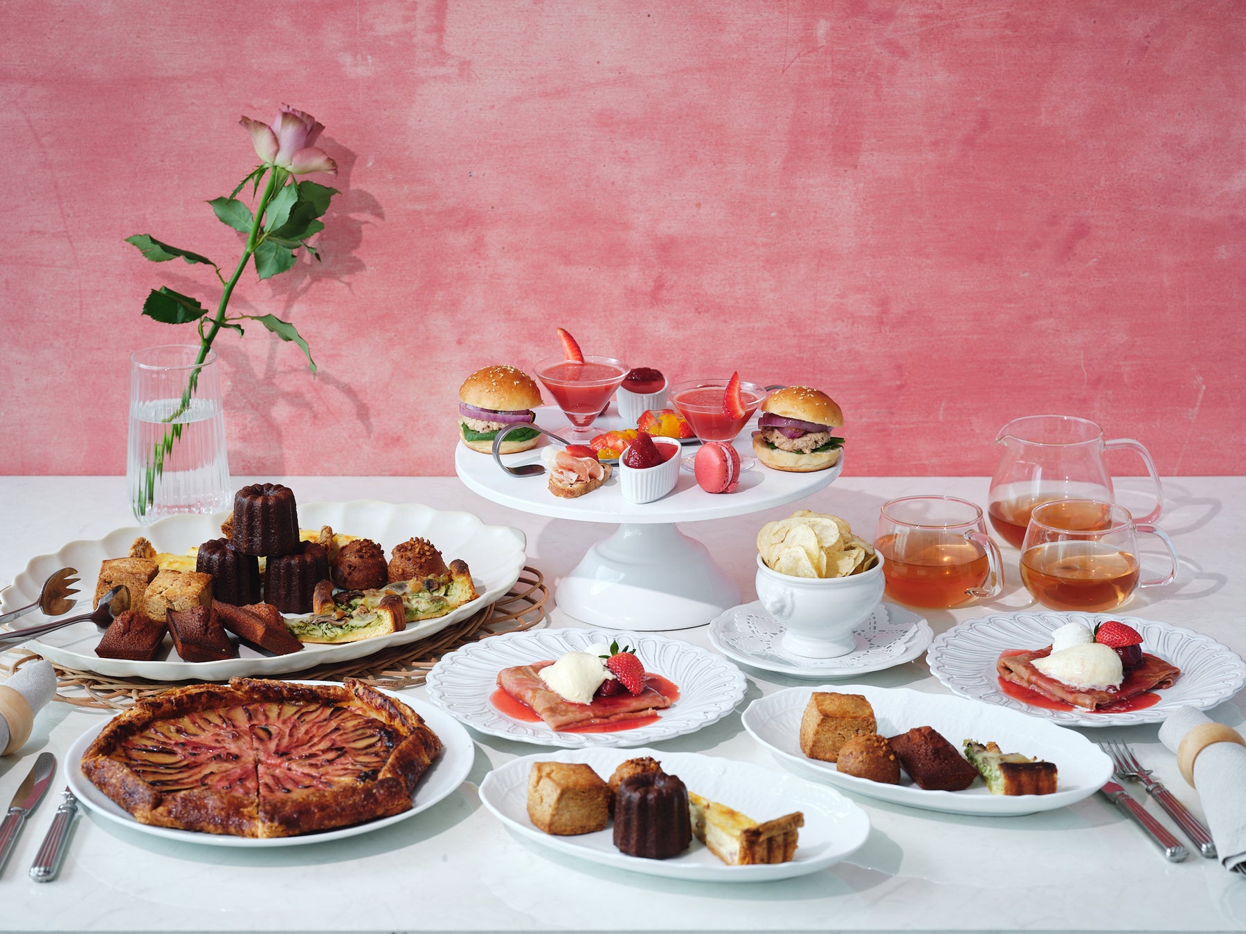 RITUEL 虎ノ門店は、Seasonal Premier Plate/プルミエプレート(季節の一皿)に、夏秋苺の酸味と生ハムの塩味が楽しめる“苺と生ハムのカナッペ”、“鴨コンフィのミニバーガー”、“夏秋苺とローズマリーのglassスープ“、夏秋苺とオレンジをマリネした”夏秋苺とオレンジのゼリー“、濃厚なレアチーズケーキと酸味のある苺のコンフィチュールの相性抜群な“ストロベリーレアチーズケーキ”、“ラズベリーマカロン”をご用意。 お客様の目の前までお運びするBake Wagon/ベイクワゴンより、“カヌレ”、”シューパリジャン“、ネクタリンを甘酸っぱくマリネしガレットとして焼き上げた”季節のフルーツガレット(ネクタリン)“、”フィナンシェレーヌ”、“スコーン”、“キッシュロレーヌ“、“チキンジェノベーゼのブリオッシュタルト”の中からお好みの焼菓子(キッシュ含む)を4種類お選びいただけます。Main Dessert/メインデザートには、全粒粉をたっぷり使用したクレープをオレンジとストロベリーのソースで煮込んだシュゼットの上に、苺のコンフィチュールとチーズババロアが軽い味わいの”夏秋苺とマスカルポーネババロアのシュゼット”。また、お口直しには、Side/サイドのポテトチップスをご用意しています。ドリンクは、ハーブティー含む10種類ほどの豊富なラインナップを取り揃え、時間内でおかわり自由となっています。