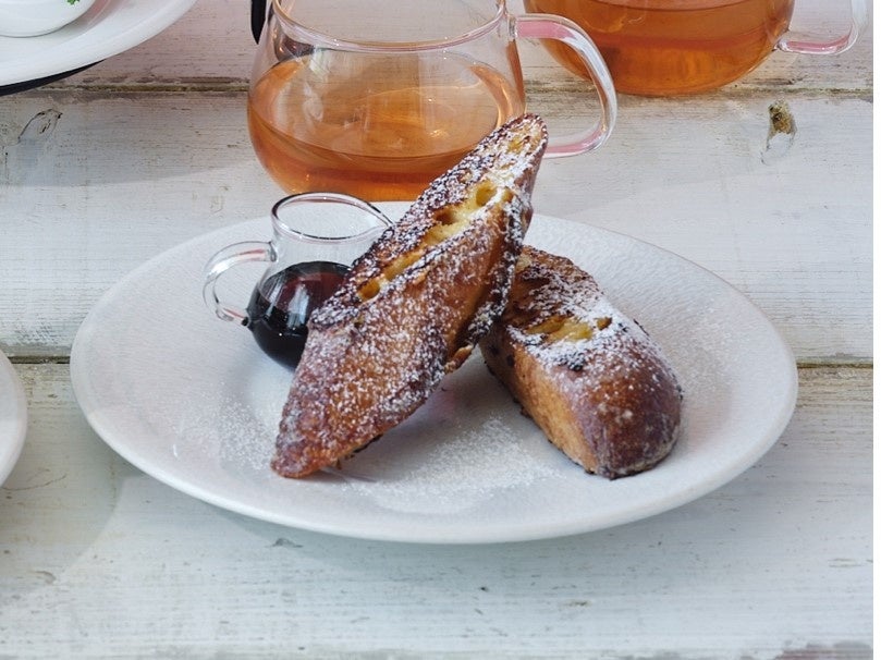 RITUEL 等々力店のティースタンドは、二段構成でご用意しました。ティースタンドとは別に、別皿で「RITUELバケット」を使用したフレンチトーストと、更に別皿で、季節限定のケーキや人気のタルトなどを含む約7種類のケーキの中からお好みの1種をお選びいただけます。紅茶、コーヒーなどの豊富なドリンクメニューが時間内でおかわり自由となっております。ティースタンド上段のお皿には、苺のソースと食べる“苺のショコラスコーン”、爽やかな酸味の苺ソースが相性抜群の“苺のレアチーズケーキ”、“夏秋苺のミニパンケーキ”、“ラズベリーマカロン”。下段のお皿には、マスカルポーネで和えた“夏秋苺とケールのフロマージュサラダ”、“パストラミと夏秋苺のタルティーヌ”、“夏秋苺のロゼスパークリングゼリー”をご用意しました。