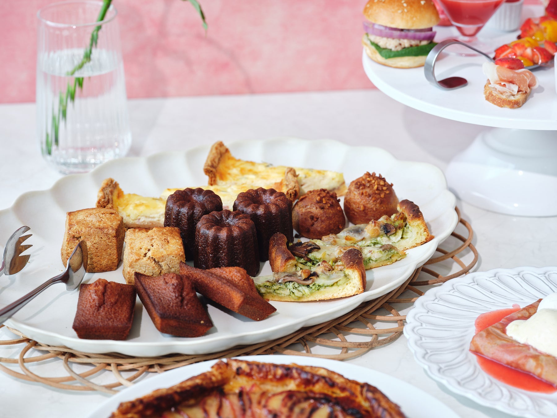 お客様の目の前までお運びするベイクワゴンは、“カヌレ”、”シューパリジャン“、”季節のフルーツガレット(ネクタリン)“、”フィナンシェレーヌ”、“スコーン”、“キッシュロレーヌ“、“チキンジェノベーゼのブリオッシュタルト”の7種類からお好みの焼菓子(キッシュ含む)を4種類お選びいただけます。