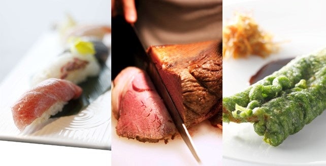 低温でじっくりジューシーに焼き上げるホテル伝統のローストビーフをはじめ、天麩羅や鉄板焼き(ディナーのみ)など、ライブ感溢れるシェフのクッキングサービスでご提供するほか、にぎり寿司をはじめ和・洋・中のニューオータニの人気の料理をお楽しみいただけます。