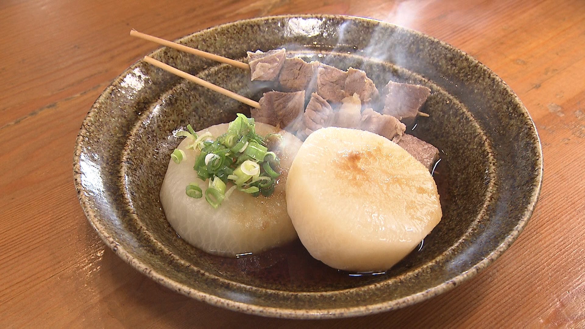 続いて、創業80年の老舗「一成だるまや」では、特徴的な姫路おでんを堪能。さらに、姫路名物「ひねぽん」、さらにはお店名物の「かき揚げ天つゆ」も頂き、味わいの深さに二人の心はすっかり魅了されます。