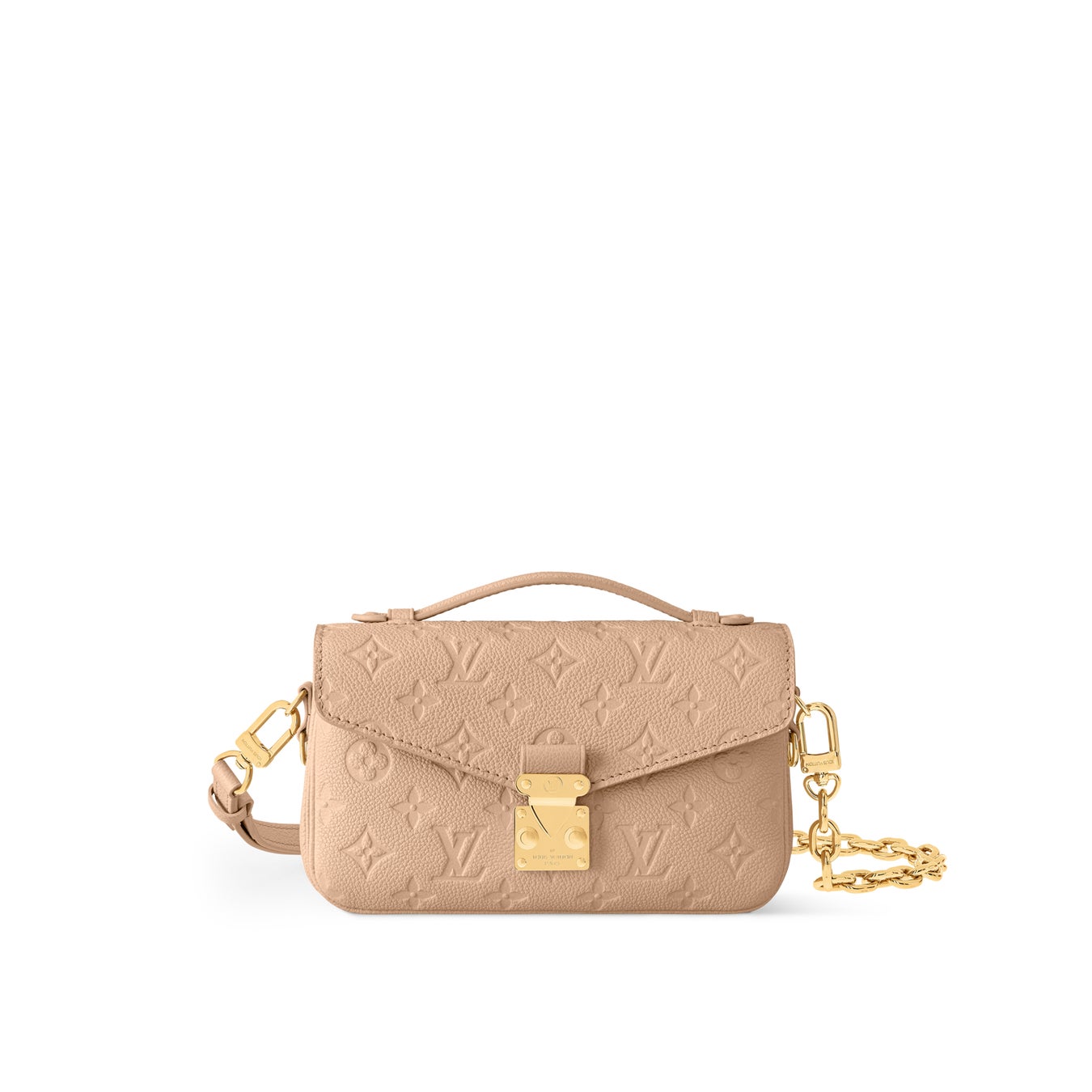 シックな印象と機能性を兼ね備えた「ポシェット·メティス EW」。メゾンを象徴するSロックスタイルの留め具や取外し可能なチェーンといったゴールドカラーの金具をあしらいました。整理しやすい内装には3つのコンパートメントと中央のファスナー式ポケットを備え、さらに外側にもポケットを配しています。