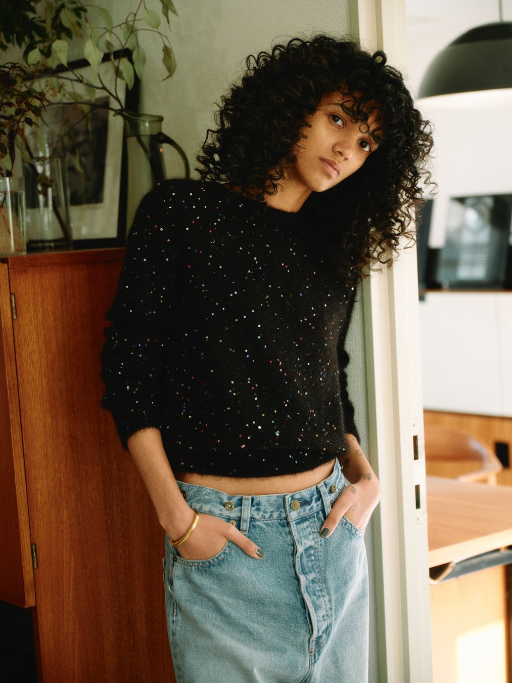 シルクのモヘア糸に小さなお花の形をしたマルチカラーのスパンコールが散りばめられたコンパクトなニットプルオーバー。
