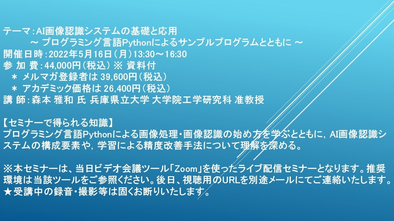 先端技術情報や市場情報を提供している(株)シーエムシー・リサーチ(千代田区神田錦町: https://cmcre.com/ )では、 各種材料・化学品などの市場動向・技術動向のセミナーや書籍発行を行っておりますが、 このたび「AI画像認識システムの基礎と応用 ~ プログラミング言語Pythonによるサンプルプログラムとともに ~」と題するセミナーを、 講師に森本 雅和 氏 兵庫県立大学 大学院工学研究科 准教授)をお迎えし、2022年5月16日(月)13:30より、 ZOOMを利用したライブ配信で開催いたします。 受講料は、 一般:44,000円(税込)、 弊社メルマガ会員:39,600円(税込)、 アカデミック価格は26,400円(税込)となっております(資料付)。