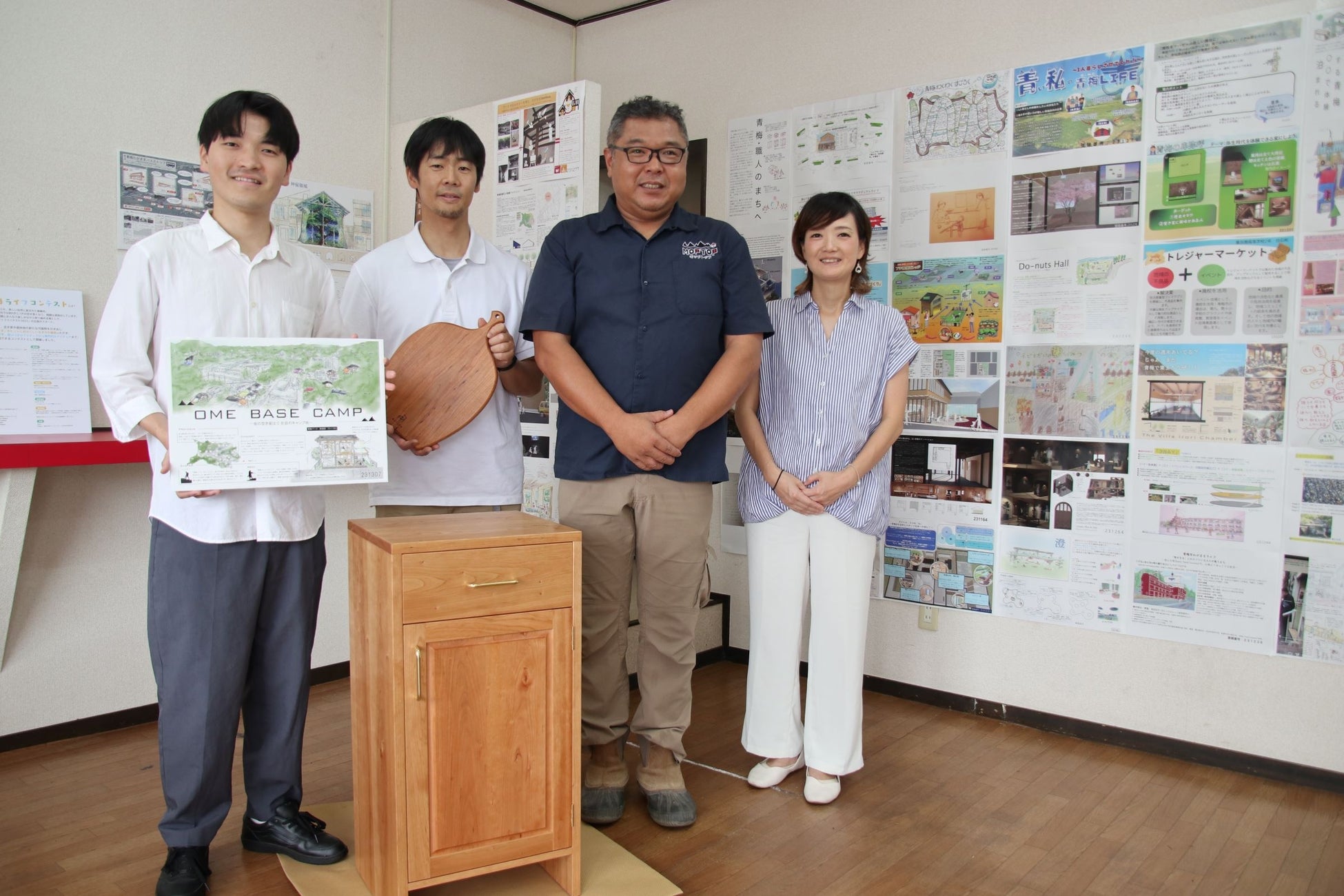 展示会に先立ち、最優秀賞を受賞した八代さんに青梅にお越しいただき、表彰式を行いました。賞品として、オーダーメイドの木工家具店・BUTLER(青梅市本町)が手がけたキャビネット他が贈呈されました。審査員と初めて対面した八代さんは、「青梅にはもともと登山をしに行く場所だったので、それがきっかけでコンテストに参加をした。最優秀賞を受賞して驚いたが、今回の会などで青梅に来ることができ、青梅との関係が深くなり、青梅のことをより知ることができた。今後も登山をしに青梅に来るが、今度は街の方も散策したいです。」と語りました。