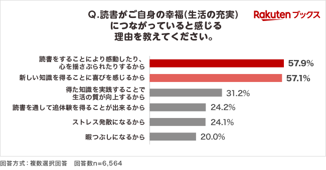読書が自身の幸福(生活の充実)につながっているか尋ねたところ、7割以上が「とても感じる」(19.3%)、「まあまあ感じる」(51.7%)と回答しました(図3)。その理由については、「感動したり、心を揺さぶられたりするから」が最多の57.9%、次いで「新しい知識を得ることに喜びを感じるから」が57.1%となりました(図4)。