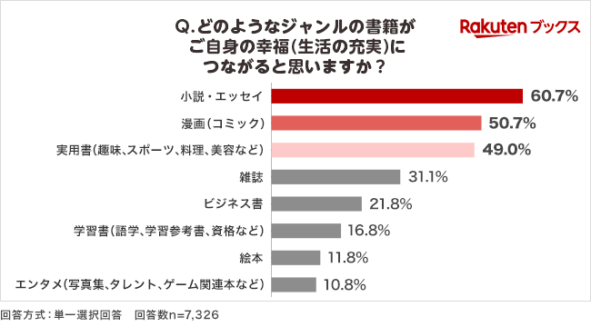 自身の幸福(生活の充実)につながる書籍のジャンルを聞いたところ、上位は「小説・エッセイ」(60.7%)、「漫画(コミック)」(50.7%)、「実用書(趣味、スポーツ、料理、美容)」(49.0%)となりました(図5)。
