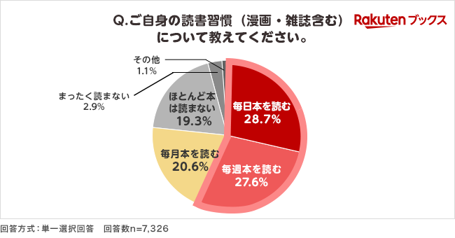 対象者に、自身の読書の頻度について尋ねたところ、「毎日本を読む」(28.7%)が最多、次いで「毎週本を読む」(27.6%)が多い結果となり、半数以上(56.3%)が週に1回以上読書をしていることがわかりました(図1)。