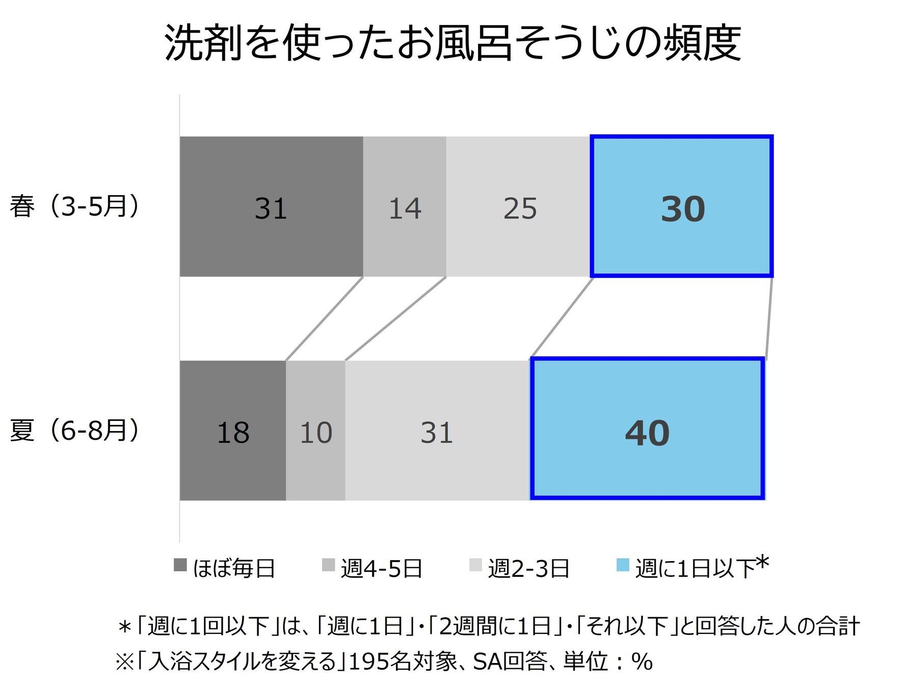 さらに、シャワーのみの入浴が増えるにつれて、洗剤を使ったお風呂そうじの頻度は低下する傾向が見られました。夏ごろ(6-8月)には、そうじ頻度が「週に1回以下」と回答した人が4割に及びます。