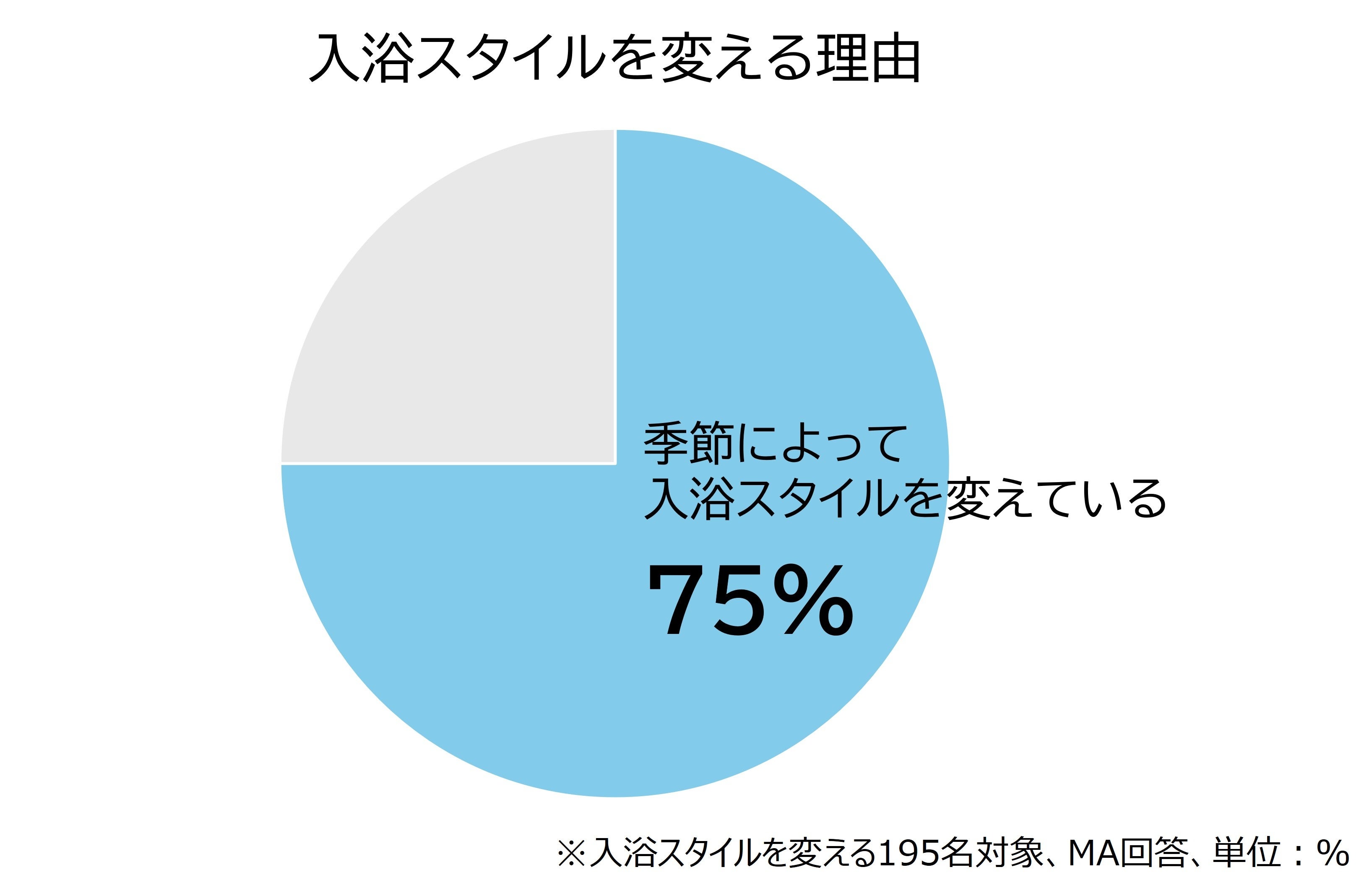 また、入浴スタイルを変える理由は「季節によって入浴スタイルを変えている」が75%と最も多く、湯船とシャワーの使い分けの多くは、季節によることがわかりました。
