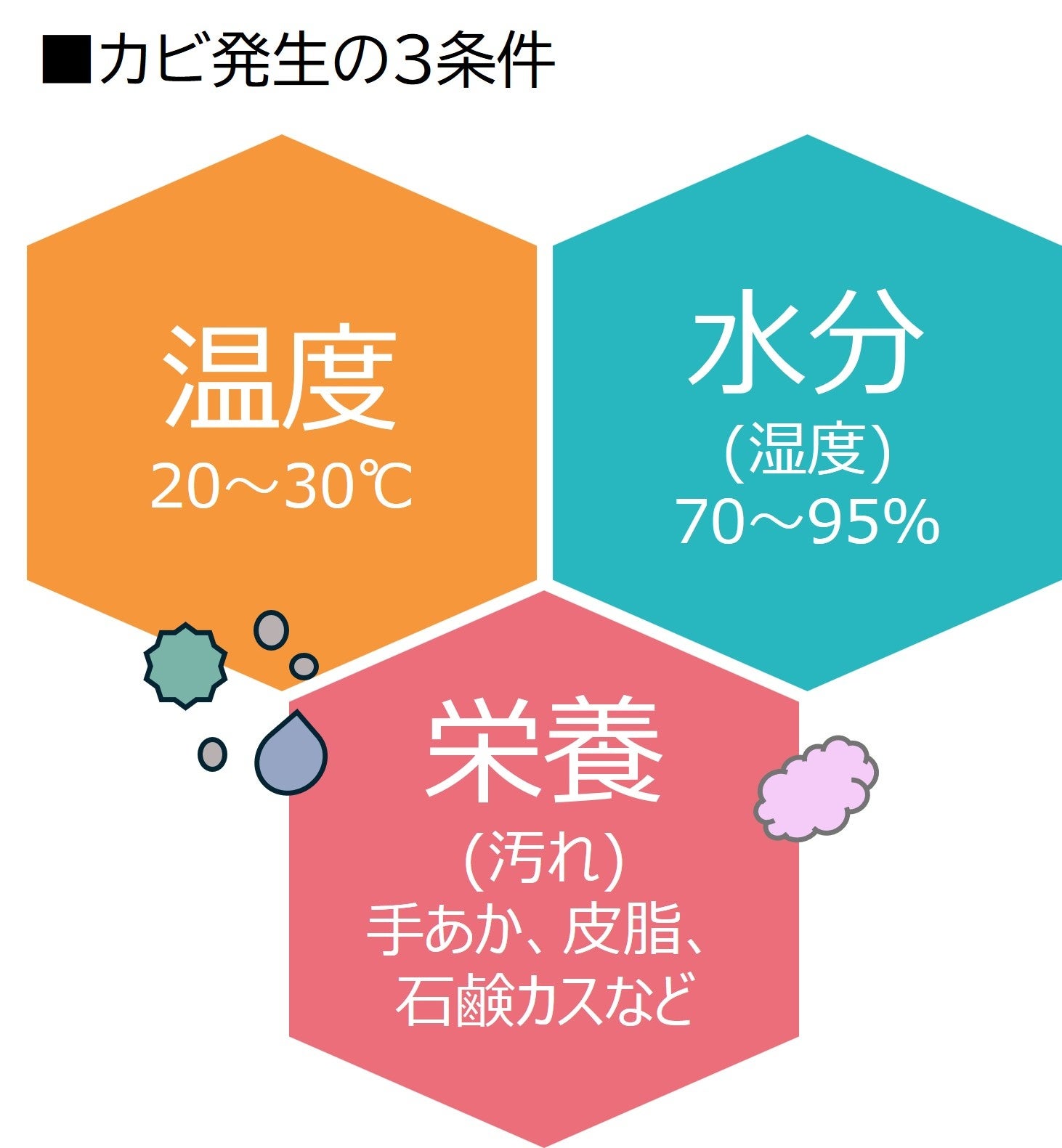 ■カビは「温度・湿度・汚れ」の3条件が揃うことで発生