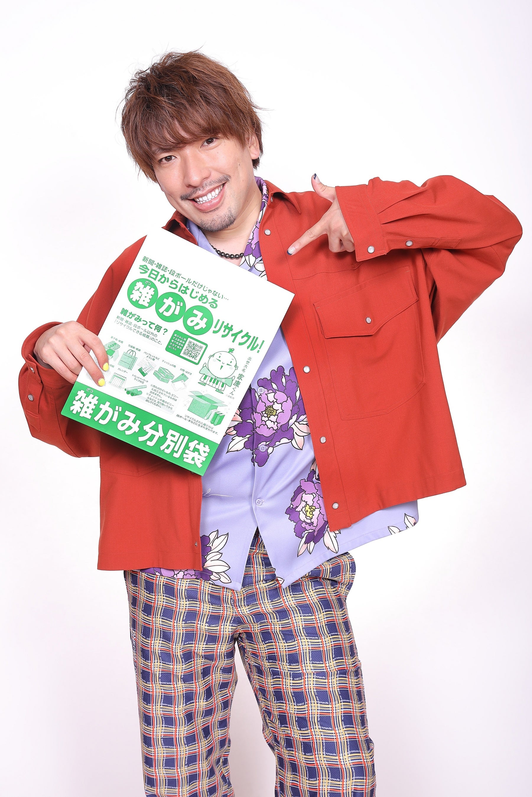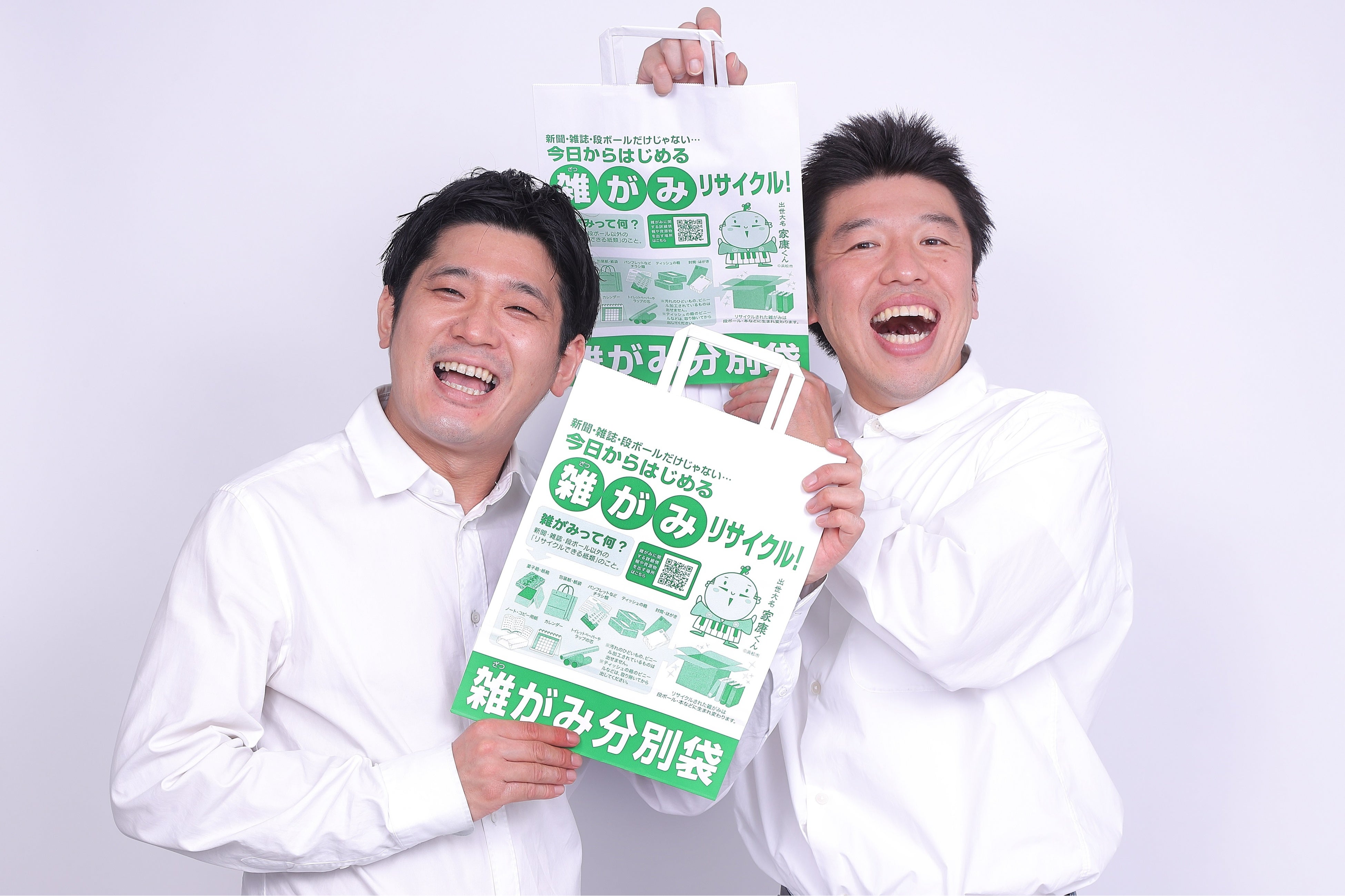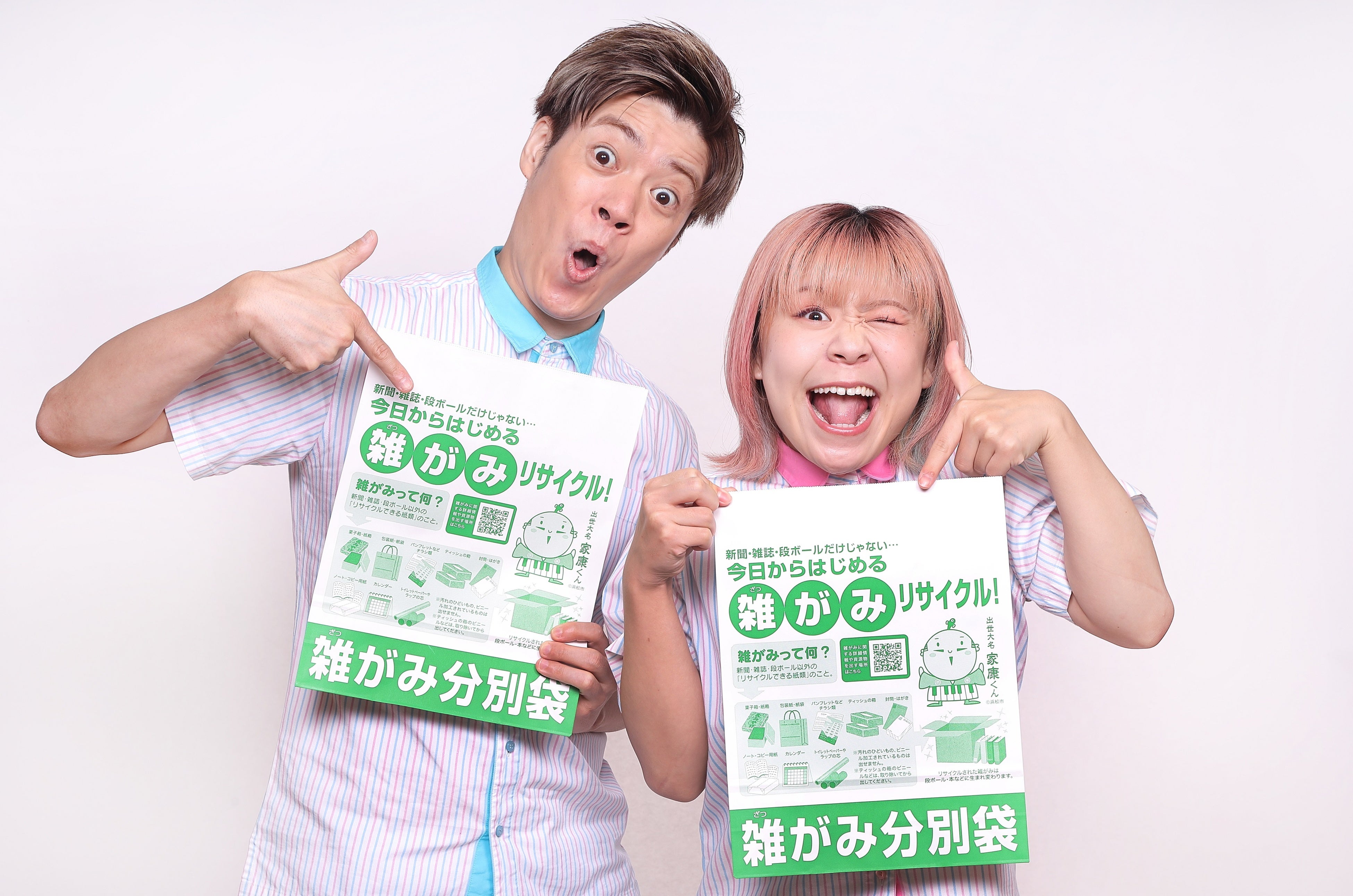 浜松市マスコットキャラクター はままつ福市長「出世大名家康くん」のイラスト入りの浜松市雑がみ分別袋を持って撮影したEXITりんたろー。、うるとらブギーズ、Everybodyの3組。