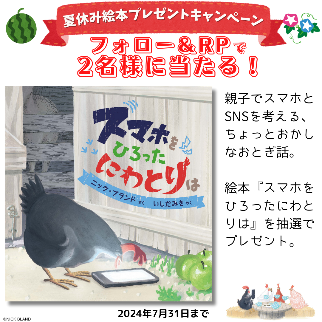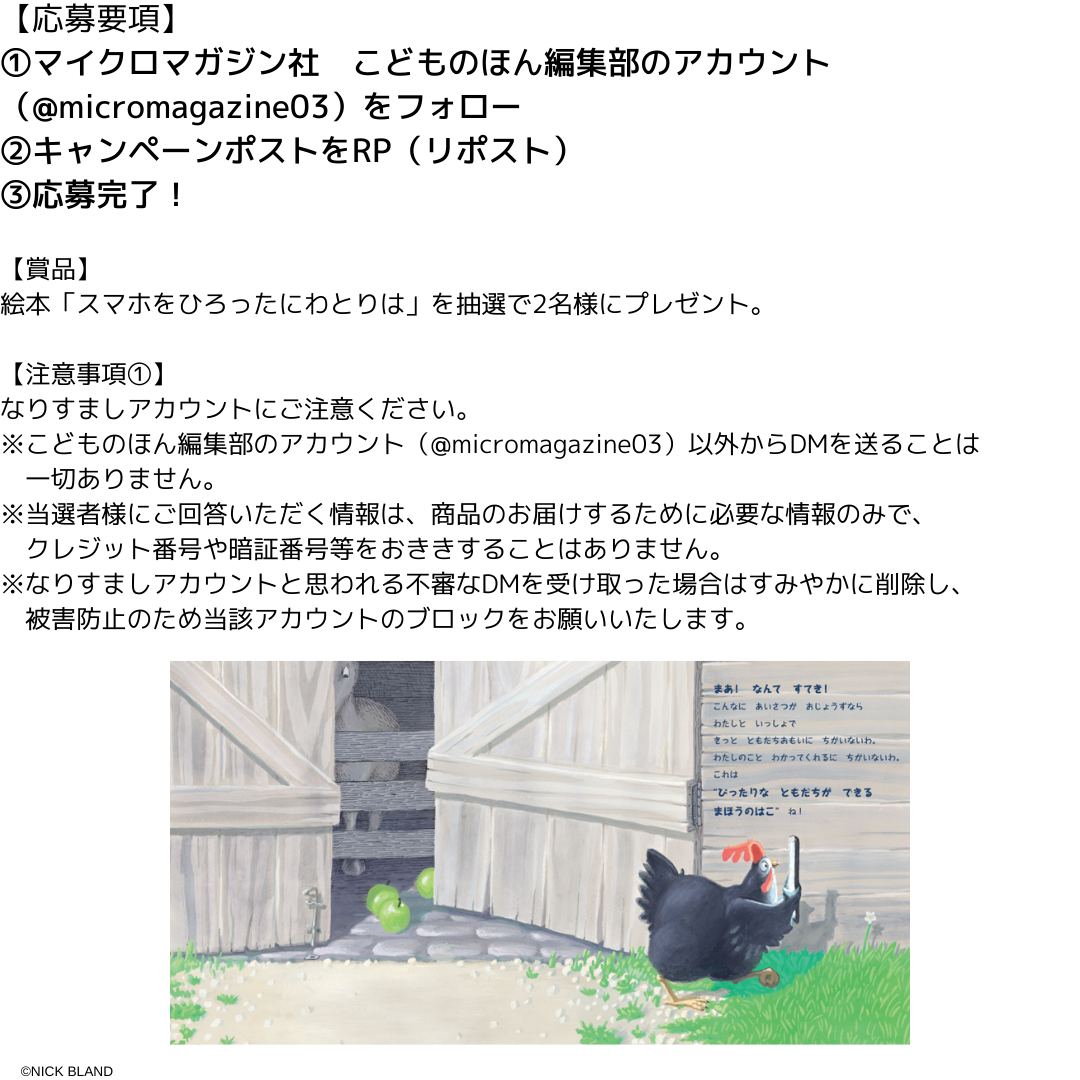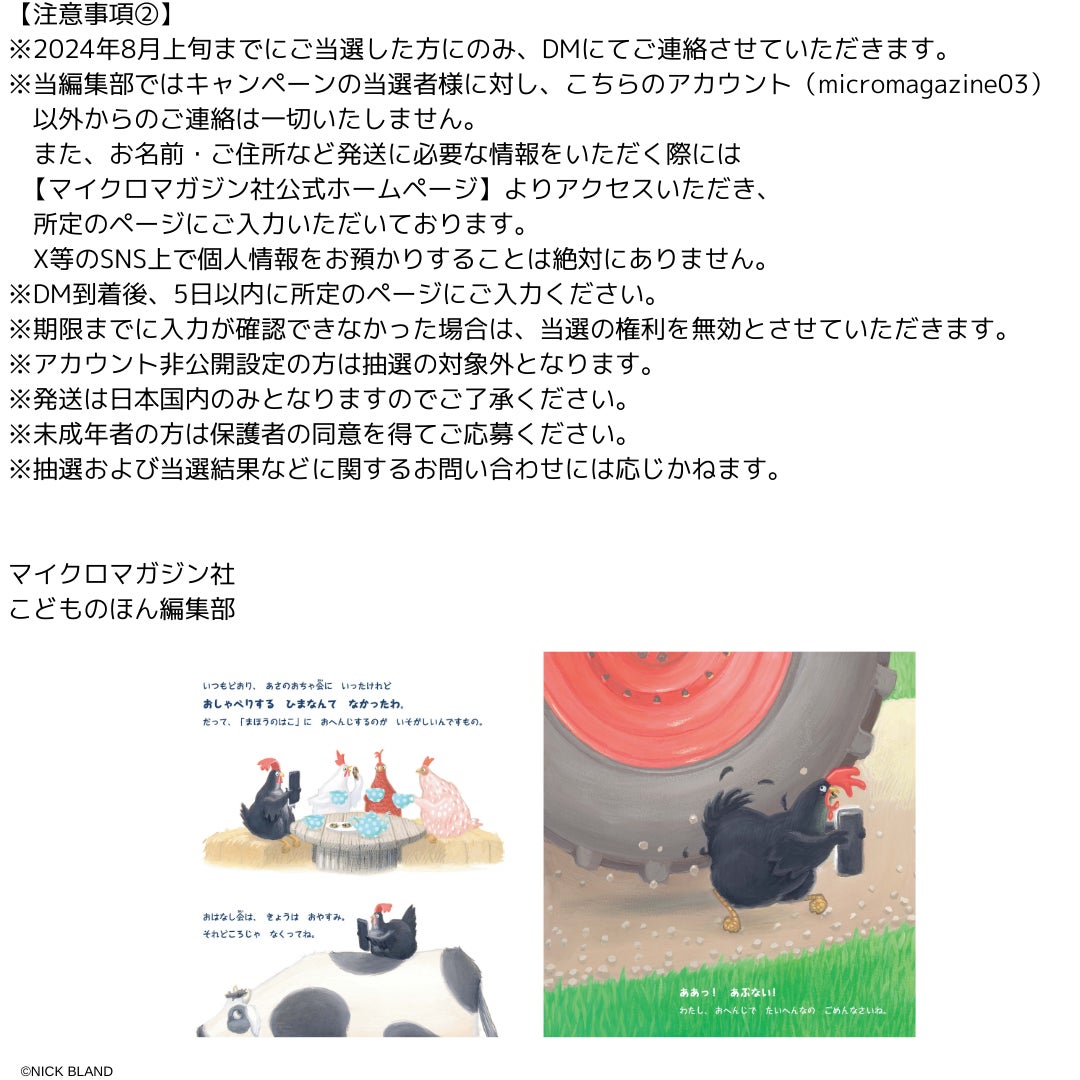 子どもを守るために読んでほしい、ちょっとふしぎなおとぎ話『スマホをひろったにわとりは』を抽選でプレゼント!マイクロマガジン社 こどものほん編集部アカウントにて夏休み絵本プレゼントキャンペーン開催!