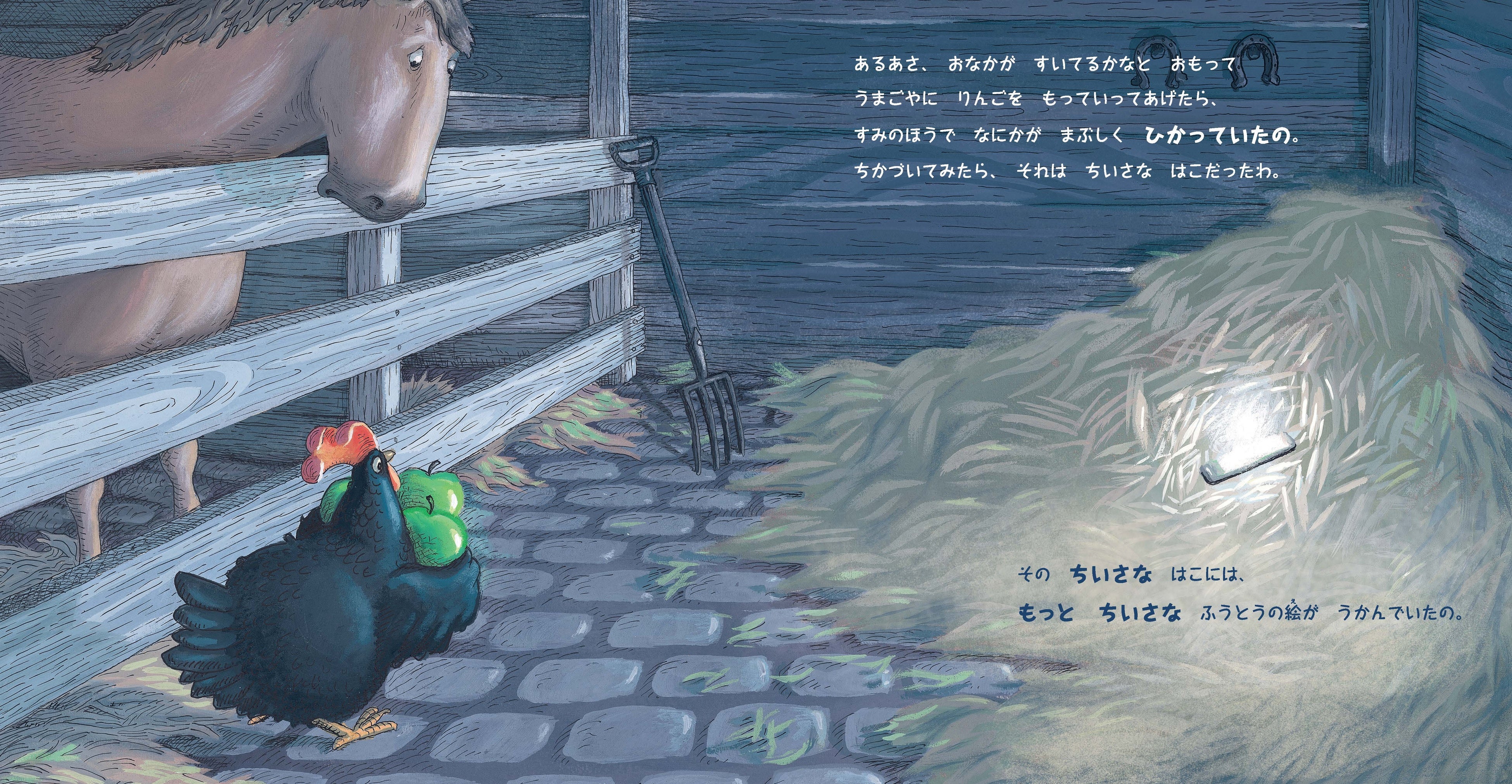 とても友達思いなにわとりが、ある日、不思議な光る箱を見つけます。