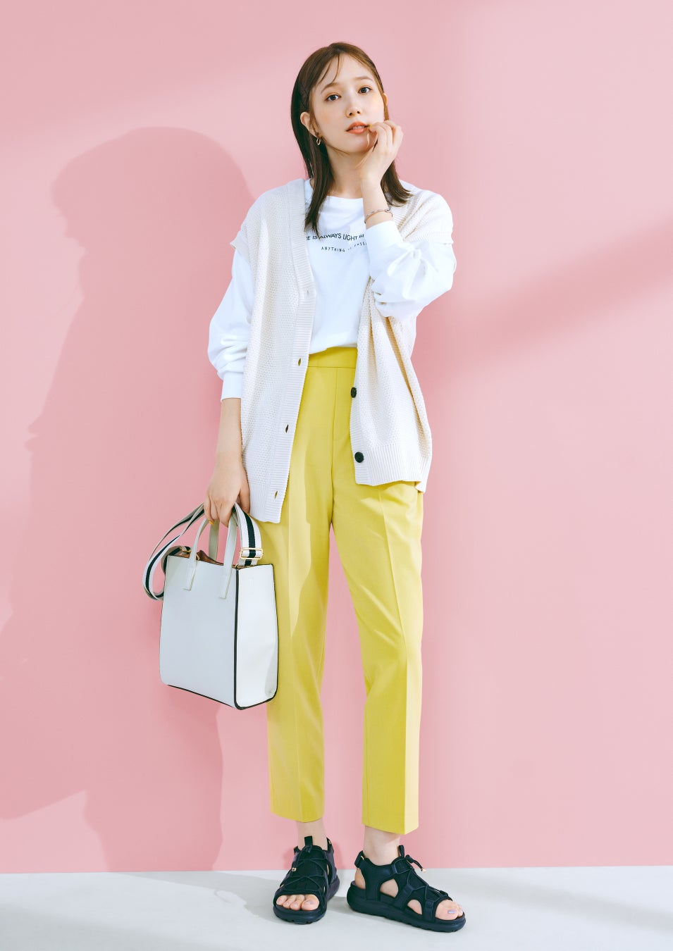 春らしい“イエロー”が目を惹くコーデは、ベーシックカラーでまとめることでパンツが引き立ちます。またワンツーコーデになりがちなロングTシャツは、ニットベストをあわせるだけでコーデ力がグッと上がります。