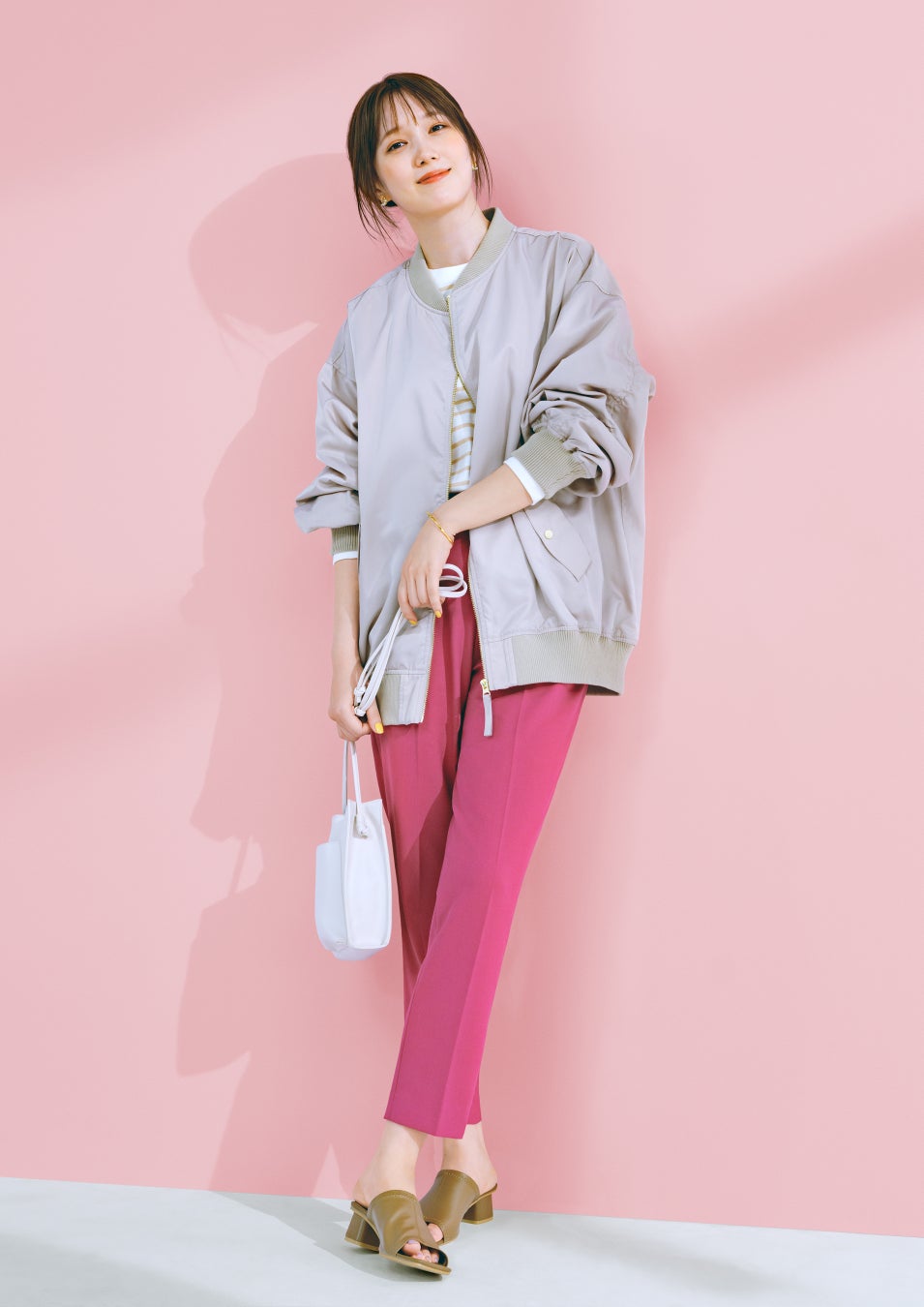 スモーキーな印象の“ピンク”のパンツはスポーティーなブルゾンを合わせることで休日のカジュアルスタイルにも活躍。ベージュトーンの小物アイテムでまとめることで華やかに品よく、落ち着いたコーデになります。