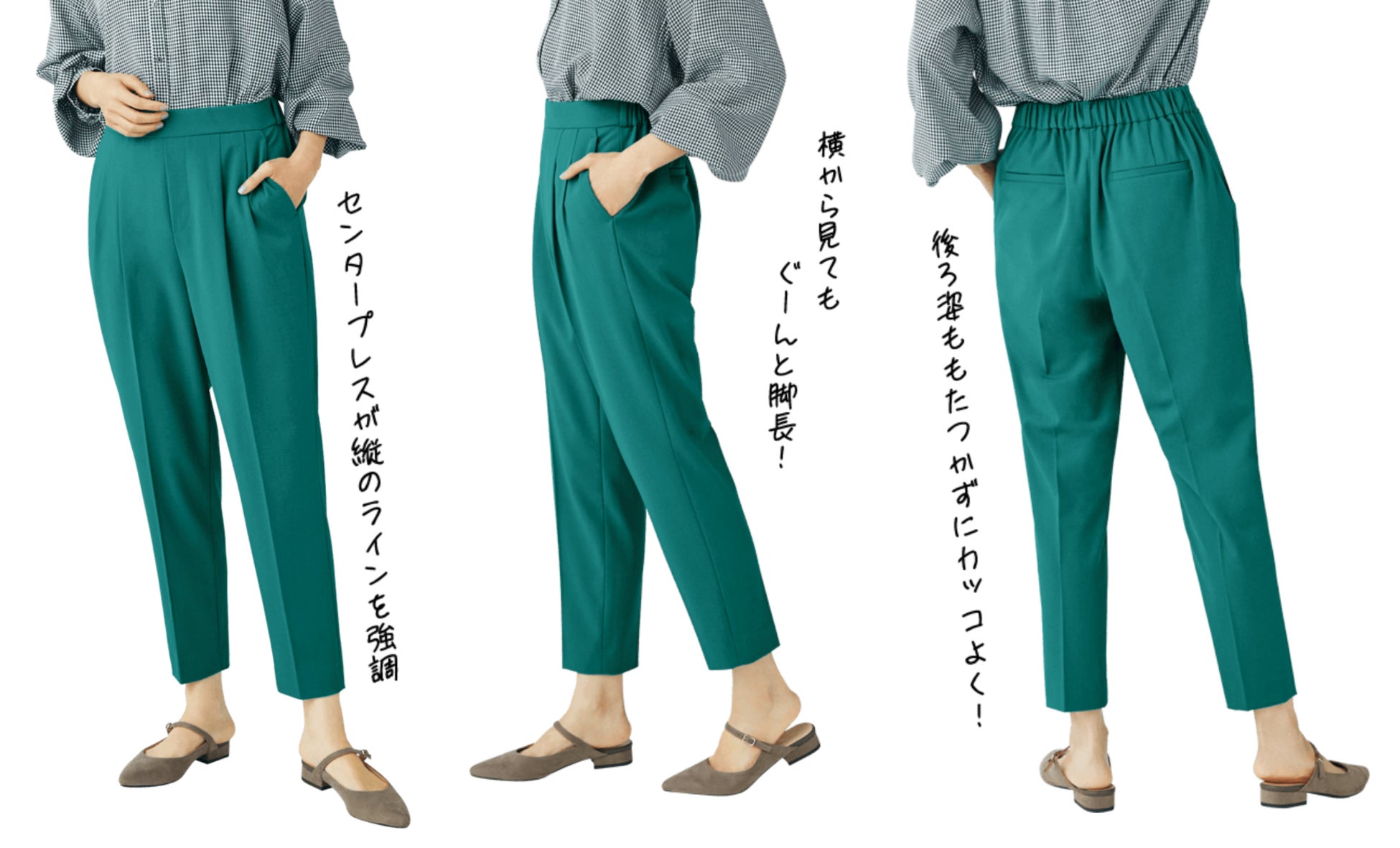 商品誕生の背景は、多くの女性が抱えている“腰まわりや脚に対するコンプレックス”を解消し、ファッションをより楽しんでいただけるパンツをお届けしたいという想いから「ウツクシルエットパンツ」を開発。前・横・後ろどこから見ても、脚を長く・細く見せるために、1mm単位で何度も調整し、細部にまでこだわることで美しいシルエットを実現しました。