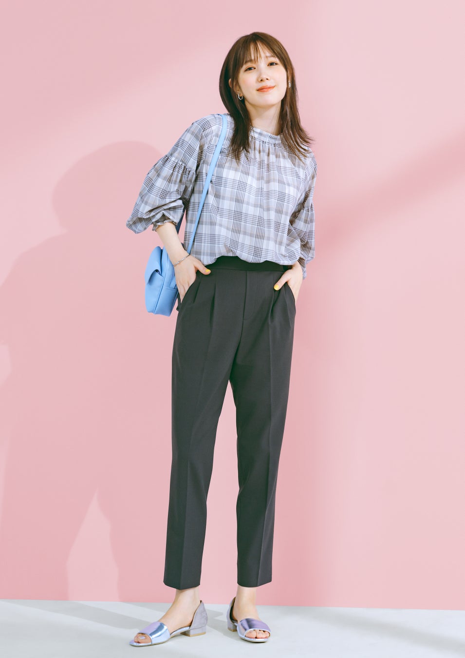 ブラックよりも柔らかい雰囲気の“スミクロ”パンツの差し色には、爽やかなライトブルーのアイテムを取り入れると大人な春コーデに。シチュエーションを問わず着られるスタイルです。