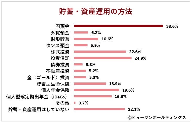 貯蓄・資産運用の方法(複数回答可)は、「円貯金」(38.6%)が最も多く、「投資信託」(24.9%)、「株式投資」(22.6%)が続きました。