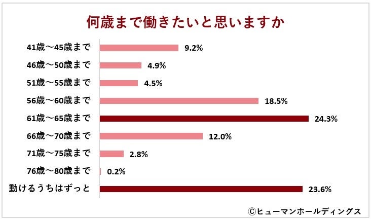 「何歳まで働きたいと思いますか」という質問には24.3%が「61歳~65歳」と回答し、最多の結果になりました。一般的に定年後の再雇用や継続雇用が始まる年齢であり、定年後も働く意向の人が多いようです。