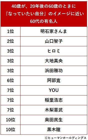 「20年後の60歳のときに『なっていたい自分』のイメージに近い有名人」を聞いたところ(自由回答)、1位は「明石家さんまさん」という結果になりました。2位は「山口智子さん」、3位は「ヒロミさん」「大地真央さん」「浜田雅功さん」が同率でランクインしました。