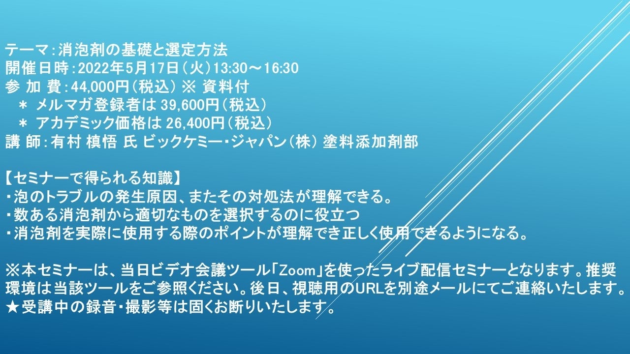 先端技術情報や市場情報を提供している(株)シーエムシー・リサーチ(千代田区神田錦町: https://cmcre.com/ )では、 各種材料・化学品などの市場動向・技術動向のセミナーや書籍発行を行っておりますが、 このたび「消泡剤の基礎と選定方法」と題するセミナーを、 講師に有村 槙悟 氏 ビックケミー・ジャパン(株) 塗料添加剤部)をお迎えし、2022年5月17日(火)13:30より、 ZOOMを利用したライブ配信で開催いたします。 受講料は、 一般:44,000円(税込)、 弊社メルマガ会員:39,600円(税込)、 アカデミック価格は26,400円(税込)となっております(資料付)。