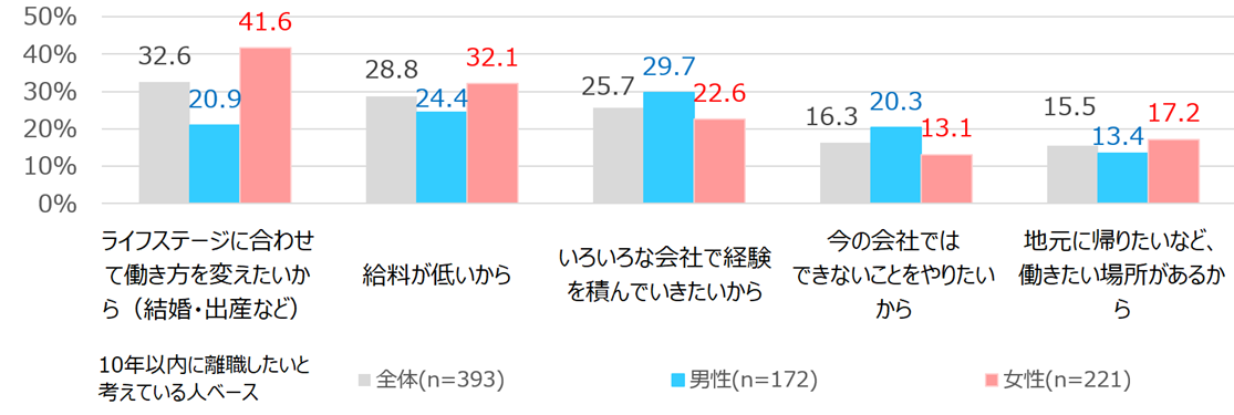 新入社員の勤続意向年数は「3年以内」が24.1%、「10年以内」では49.1%となった。男女別に勤続意向年数をみると「3年以内」と答えたのは、男性が18.3%、女性が30.0%となった。10年以内に離職を考えている人に今の会社で働き続けない理由を聞くと、「ライフステージに合わせて働き方を変えたいから」で、男性が20.9%に対し女性が41.6%と約2倍の結果になり、出産など自身の環境変化への対応差が感じられる。【図3、4】