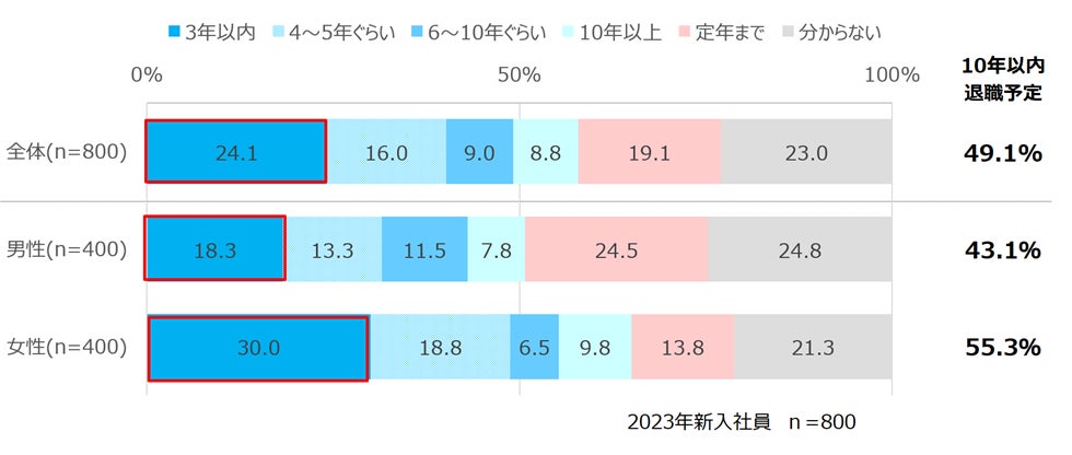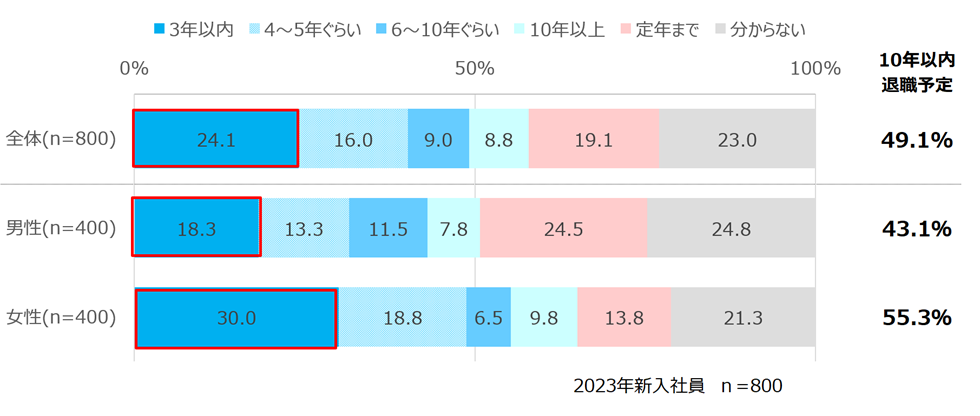 新入社員の約半数が10年以内に退職予定。3年以内の退職意向者は男性18.3%、女性は30.0%。女性はライフステージの変化に備え早めのキャリア形成を視野に【図3、4】