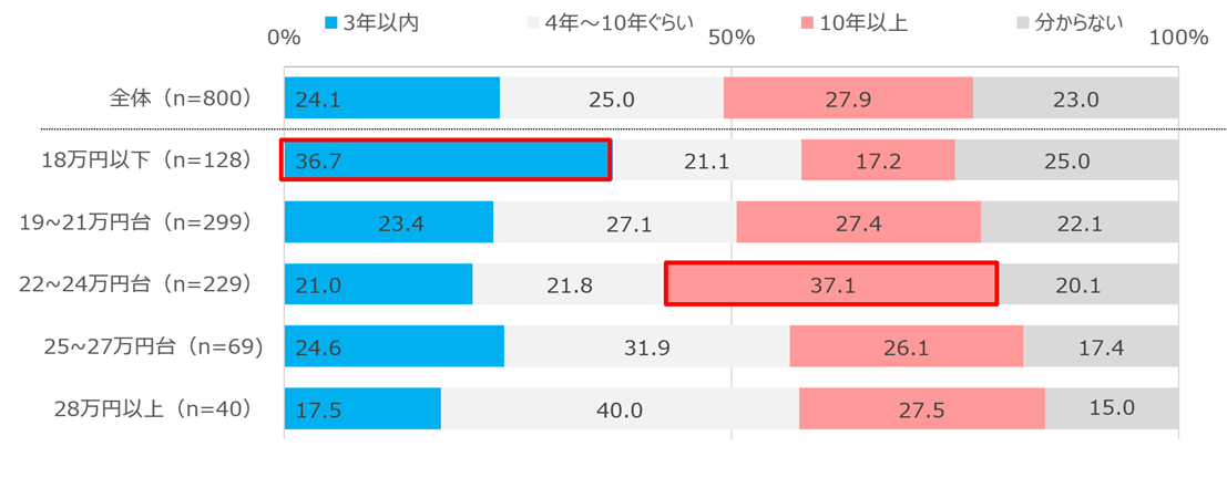 月収別に勤続意向年数を見ると、月収18万円以下では「3年以内」が36.7%で最も多く、月収22万円~24万円台では「10年以上」が37.1%で最多となり、月収が勤続意向年数に影響【図5】
