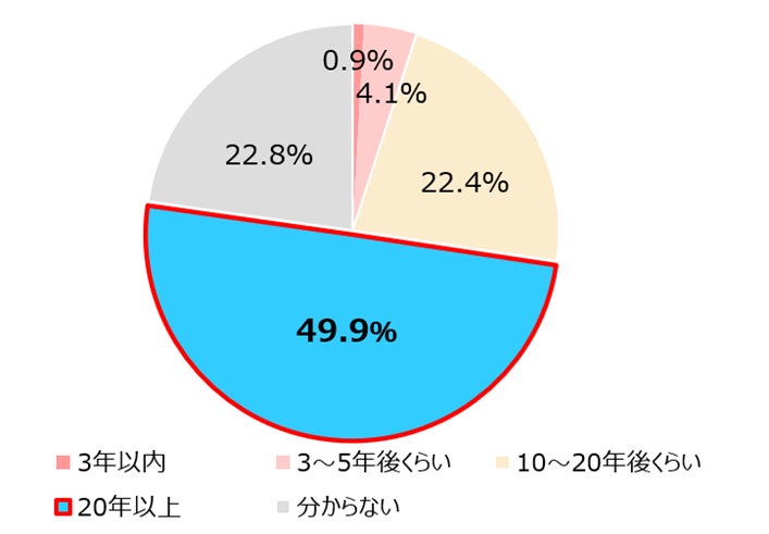 「今の会社」「今の仕事」が20年以上あると思う人は半数に。「IT」「経理・事務・企画」で3割が「10年以内に仕事がなくなると思う」と回答。「医療・福祉・教育」では「20年以上あると思う」が6割超え