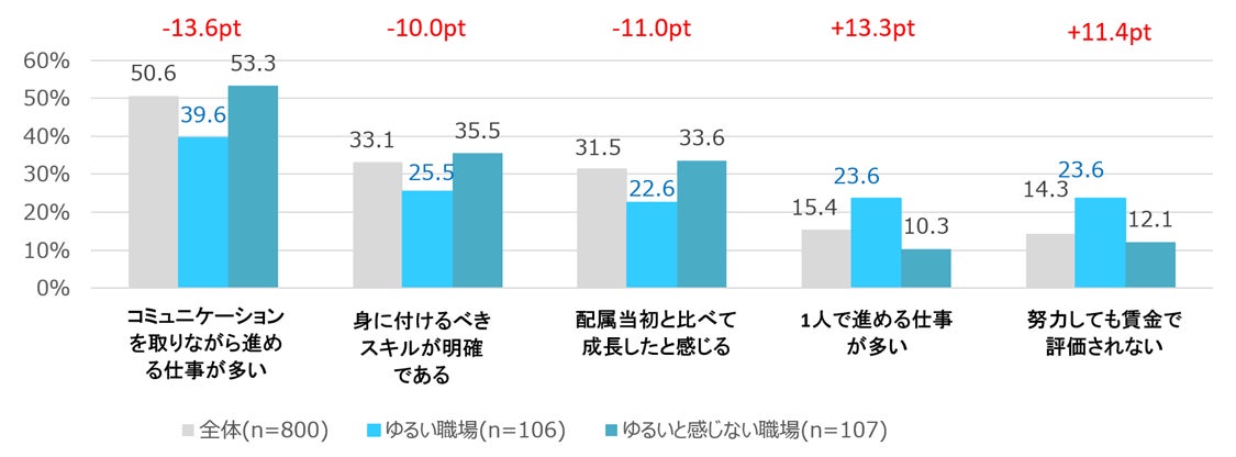 ※「ゆるい職場」と「ゆるいと感じない職場」の差が大きい5項目抜粋