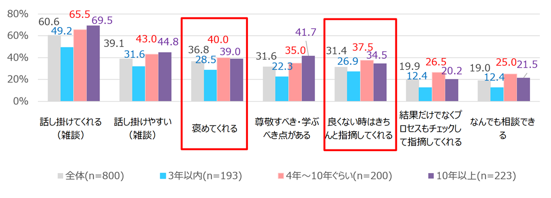 【図8】Q.上司・先輩の態度や行動でうれしかったこと(勤続意向年数別)