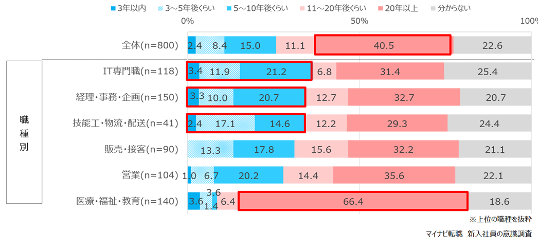 新入社員に対して、今の会社が何年後まであると思うかを聞いたところ、「20年以上」は49.9%と約半数となり、今の職務内容でも「20年以上」は40.5%となった。特に「IT」「技能工・物流・配送」「経理・事務・企画」などでは「10年以下」が3割を超えた。DXや生成AIの出現をはじめ、社会が変化していくなかで今後も同じように働き続けることができるのか、不安を感じている様子がうかがえる。一方「医療・福祉・教育」では「20年以上」が66.4%と、全体平均よりも25.9pt高い結果となった。少子高齢化の影響もあり今後も継続してニーズがあると感じているようだ。【図1、2-1、2-2】