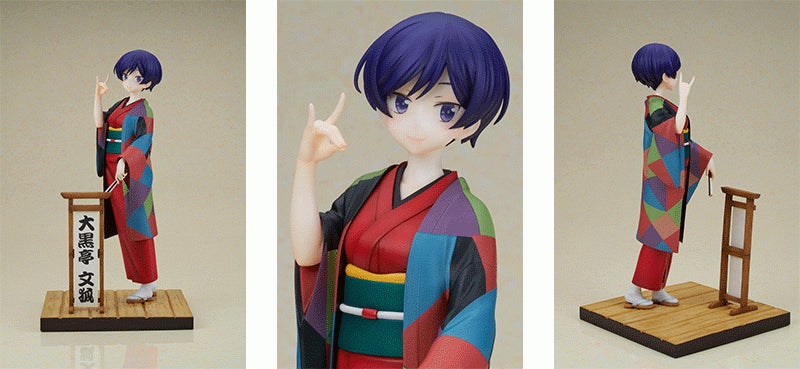今回「F:NEX」では師匠の「大黒亭文狐」と弟子の「大黒亭まめだ」をそれぞれ1/7スケールでフィギュア化。傾げた耳と着物から飛び出したふわふわとしたしっぽが可愛いらしいまめだと、所作がしなやかで指先まで美しい文狐を丁寧に表現。ティザービジュアルを再現した着物は、帯や帯留めはもちろん、足袋や下駄も細部に至るまでこだわりました。また、高座をイメージした台座は2体並べてお飾りいただく事で作品の世界観がいっそうお楽しみいただけます。