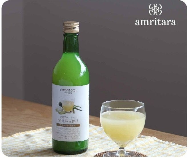 国産オーガニックコスメの「アムリターラ」は、素材を大切にした食のラインアップも豊富。沖縄で栽培期間中農薬不使用の肉厚なアロエベラに、シークヮーサー果汁とアガベシロップを加えてドリンクに。水を一滴も使わず、あら搾りで仕上げたアロエベラの粒食感とシークヮーサーの香りが沖縄を感じる、すっきり爽やかな味わいです。
