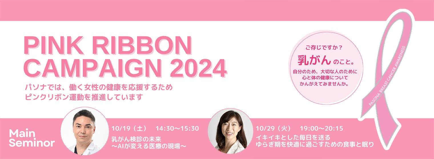 株式会社パソナ(本社:東京都千代田区、代表取締役社長COO 中尾慎太郎) は、10月の「乳がん月間」に合わせて、乳がんの早期受診を促進し働く女性を応援するため『ピンクリボンキャンペーン2024』を実施いたします。乳がんをはじめとした女性の健康について考える各種セミナーやウォーク・ランイベント、コンサートなどを東京・大阪およびオンラインにて開催してまいります。