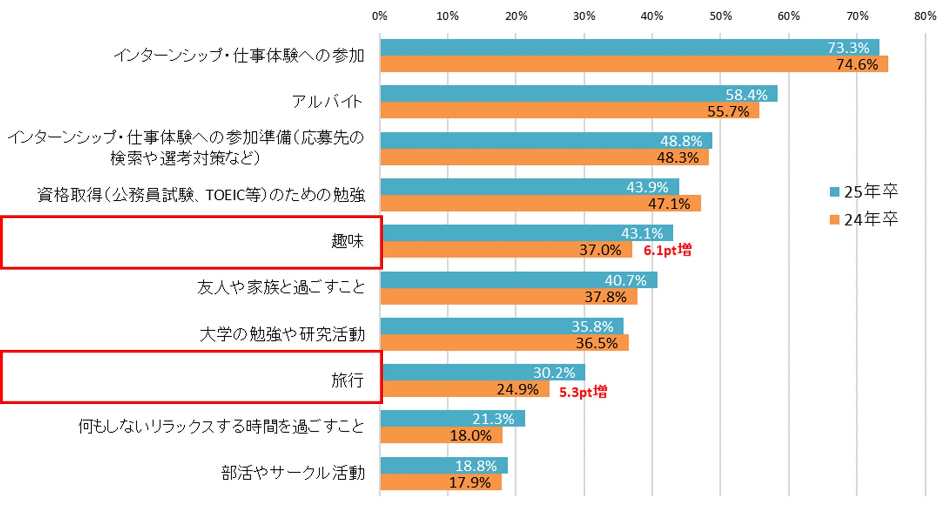 夏季休暇の予定は「インターンシップ・仕事体験への参加」が前年に引き続き最多で73.3%。前年から5.0pt以上増加したのは「趣味」「旅行」【図4】