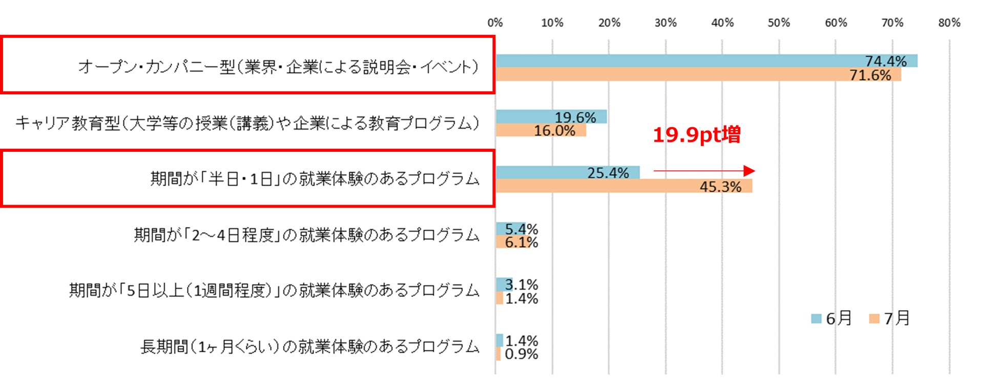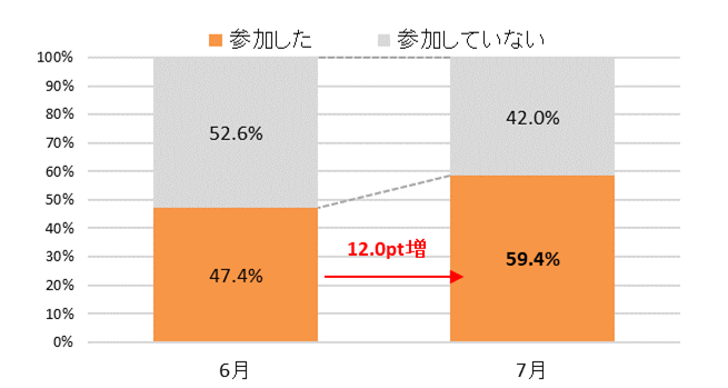7月にキャリア形成活動に参加した学生は前月比12.0pt増の59.4%。「『半日・1日』の就業体験のあるプログラム」の参加割合が前月から19.9pt増加【図1、2】