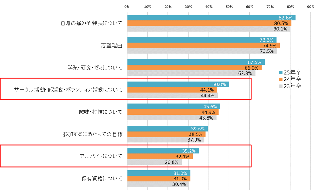 インターンシップ・仕事体験の選考を受けたことがある人に、選考(ES・面接)で聞かれたことを尋ねると、「自身の強みや特長について」が最多で82.6%だった。直近3カ年で比較すると、「サークル活動・部活動・ボランティア活動について」(前年比5.9pt増)、「アルバイトについて」(前年比3.1pt増)の増加が目立った。課外活動に関する質問は、コロナ禍で行動制限があった際には学生が答えづらいとされていたが、25年卒の学生では徐々に増えてきているようだ。【図3】